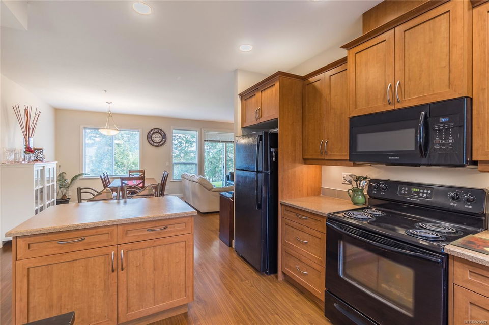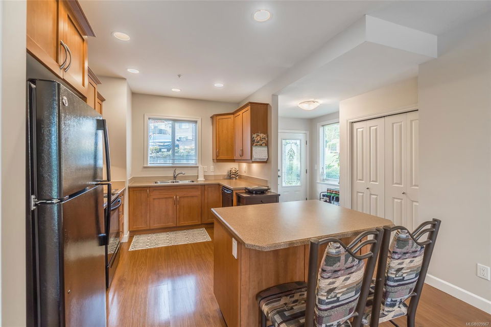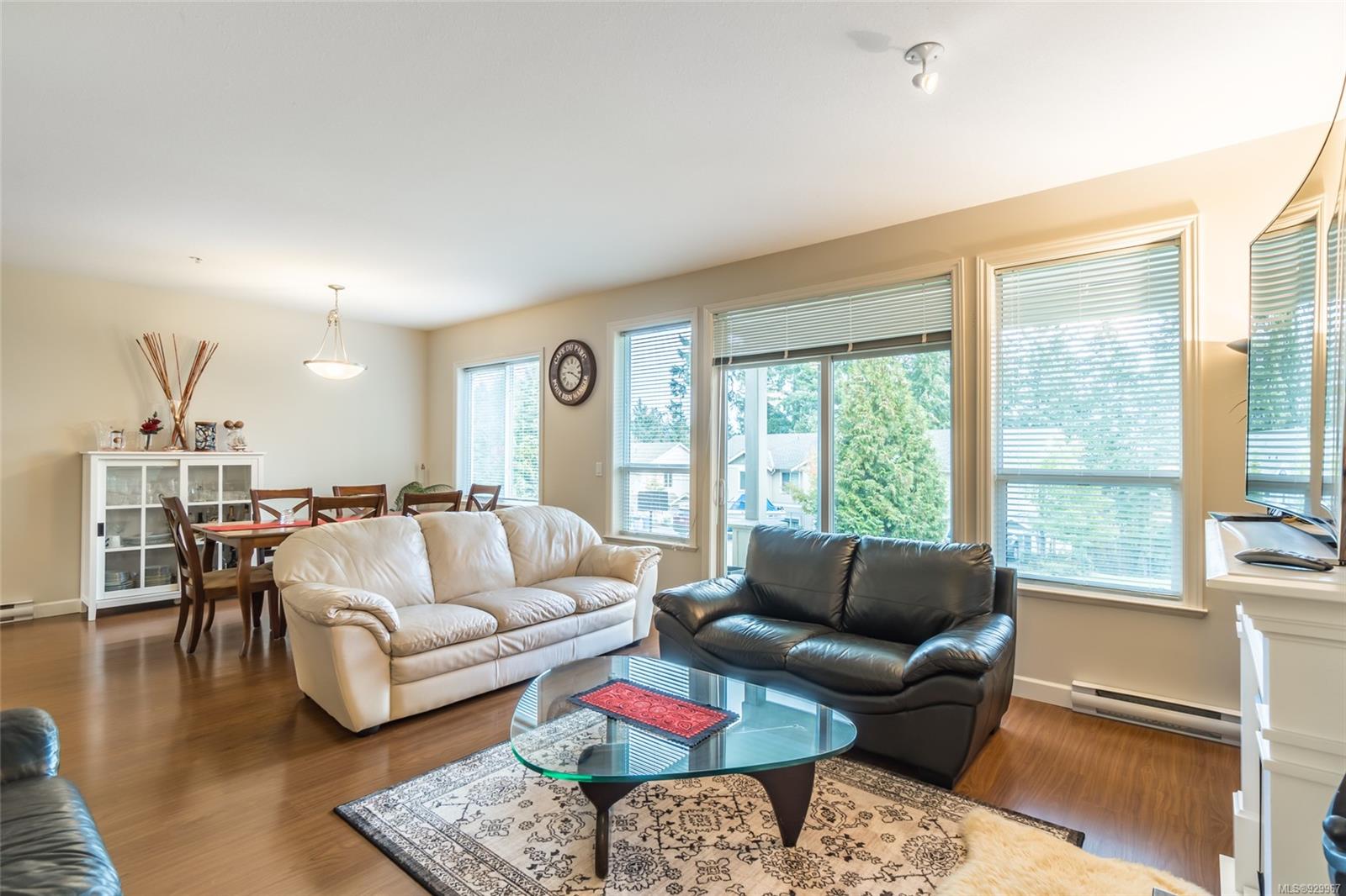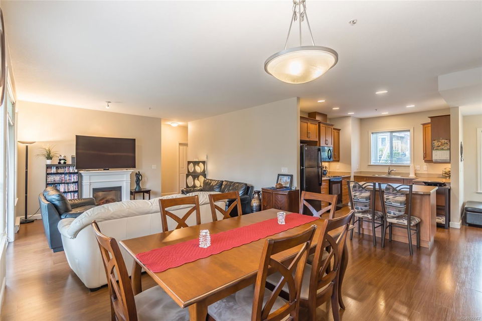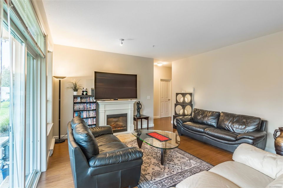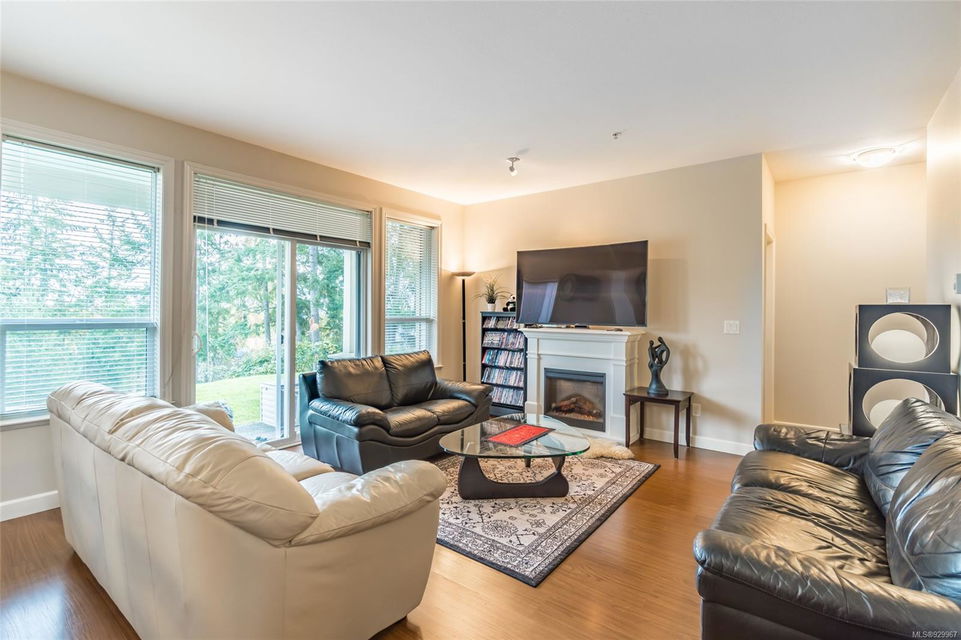 The ease of one-level living, an open floorplan saturated with light, and a well-cared for end-unit condo within a centrally-located and green landscape – yes! The bright, broad entry of this 3-bedroom, 2-bath condo leads into the kitchen (quality cabinets, island), dining and generous living space (fireplace for cosiness). All bedrooms in a “wing” with laundry nearby. Primary bedroom’s ensuite features a large shower and walk-in closet. Attractive flooring, 2 covered patios, and 2 parking spots. NO RESTRICTIONS re: age or rentals makes this a desirable home base or smart investment (university nearby!). This quiet retreat-just a short walk to Colliery Dam Park and near Morrell Nature Sanctuary – is tasteful to a T.
