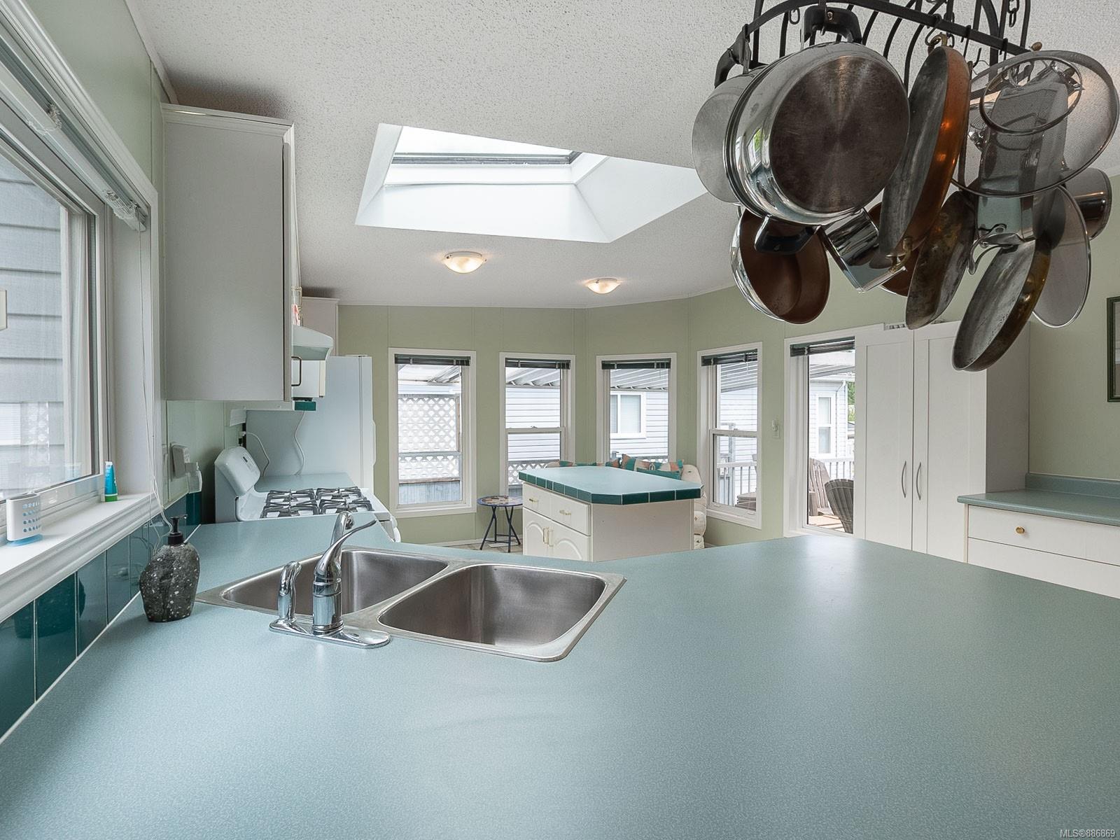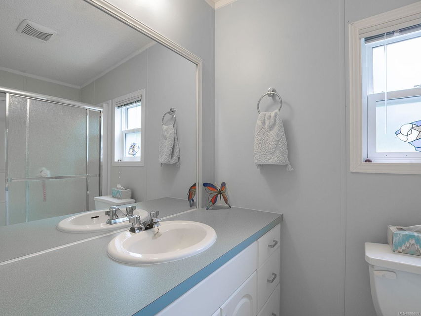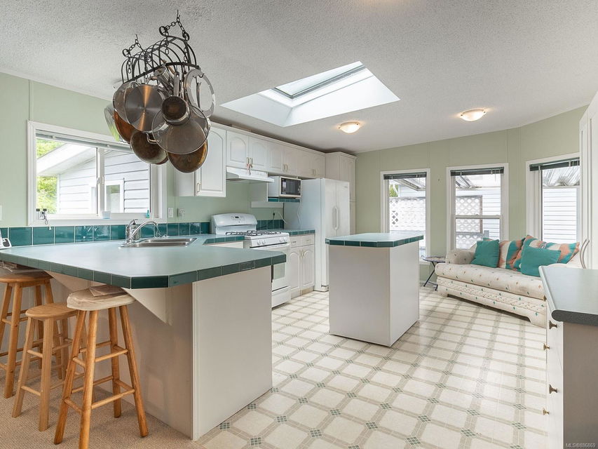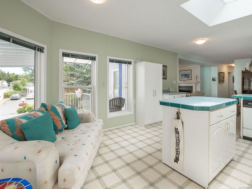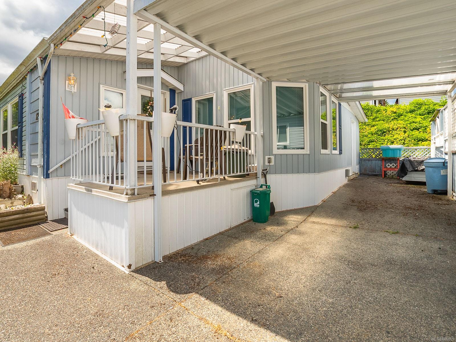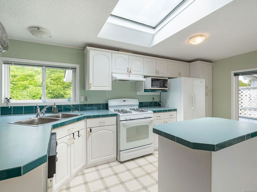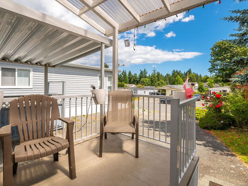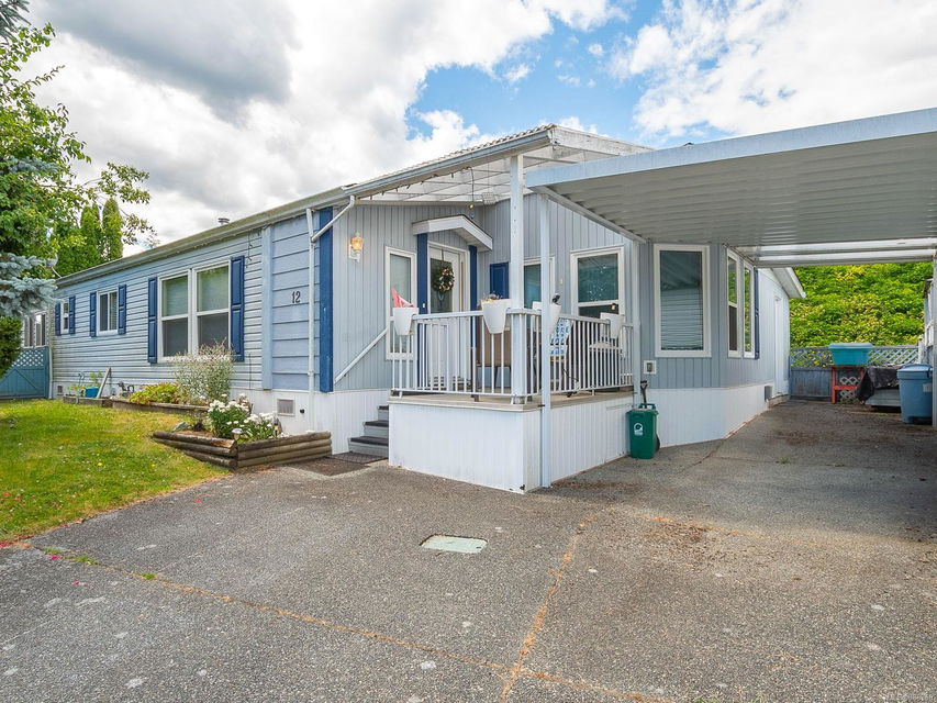 It begins with great street appeal & leads into a bright, fresh 1487 sq. ft. double wide home in a quiet 55+ neighborhood in Ladysmith. This well- maintained gem is ready to welcome new owners. The impressive kitchen features ample work & cupboard space, skylight & island. The front room is extra comfortable with a gas fireplace and the family room features a vaulted ceiling. There are 3 bedrooms & 2 baths, with the primary bedroom ideally located at the back of the home with a 3 piece ensuite. Skylights add loads of natural light. Fresh upgrades include new carpets throughout & new air conditioning. Enjoy a covered deck, easy parking in the covered carport and shed for extra storage. With a lovely garden & forested hills in the backdrop, this home’s private setting on a corner lot in a cul-de-sac will appeal to many. With shopping nearby and access to bus service, learn how easy it is to slide into Ladysmith living!