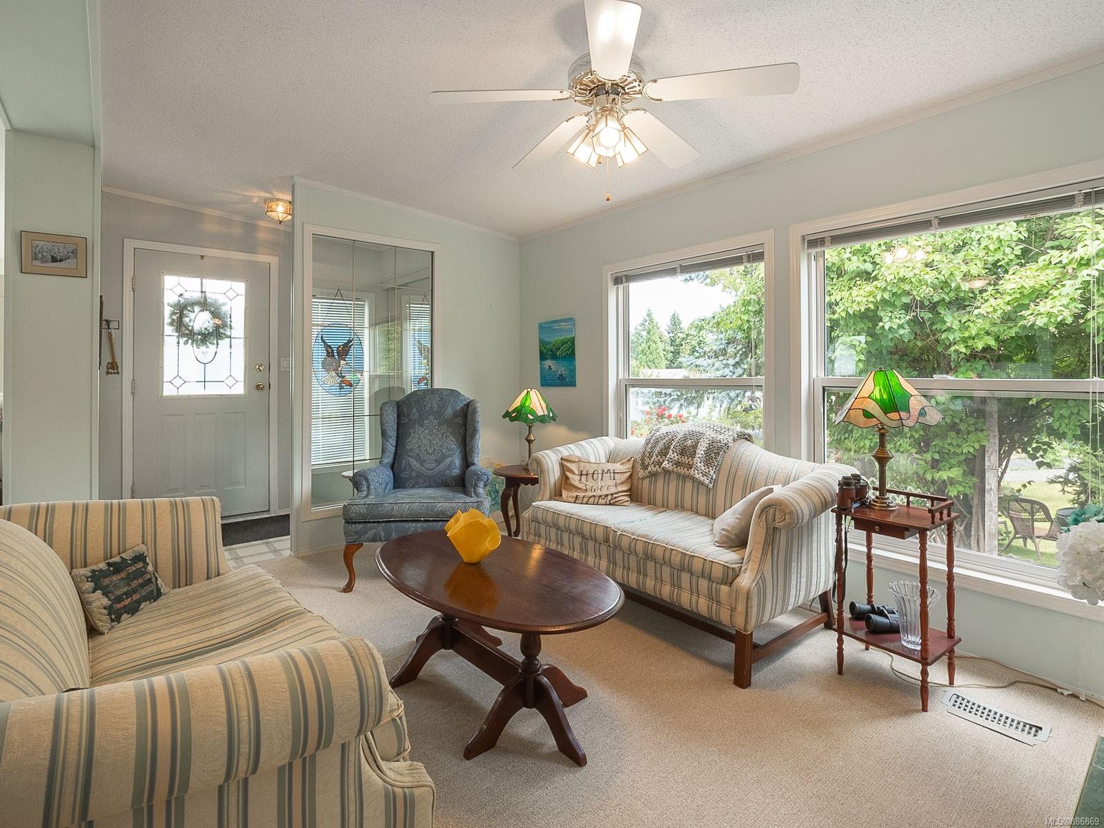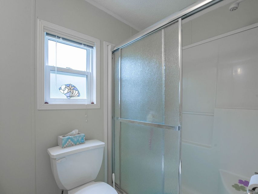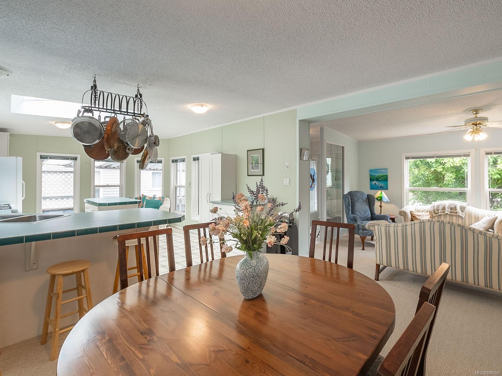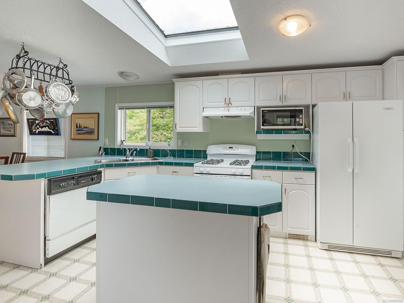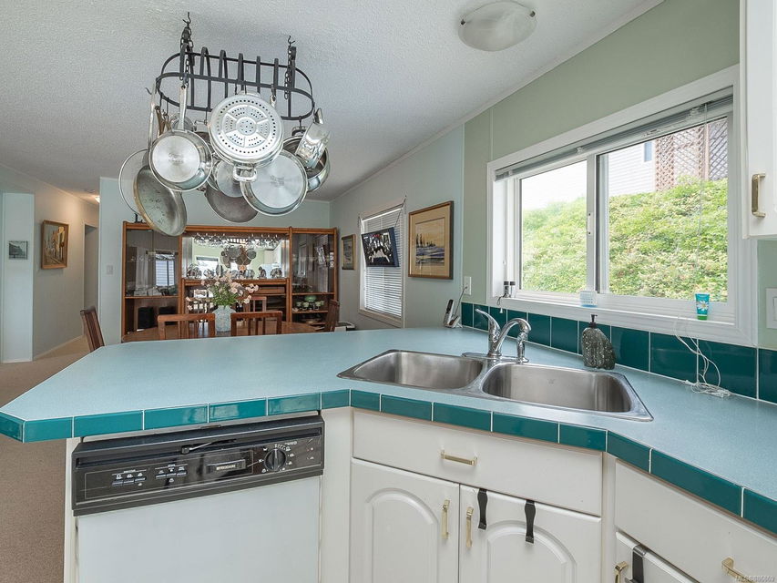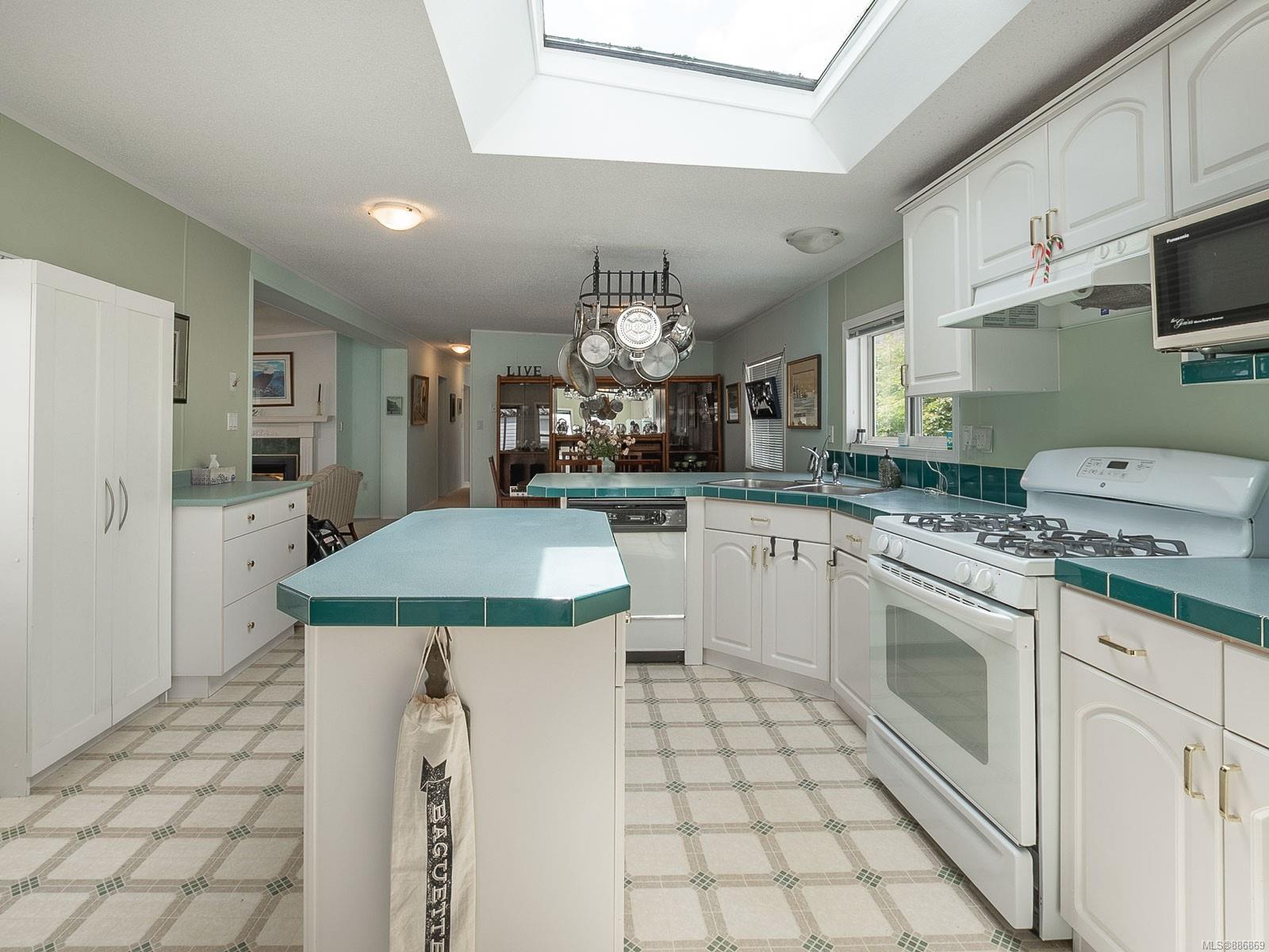 It begins with great street appeal & leads into a bright, fresh 1487 sq. ft. double wide home in a quiet 55+ neighborhood in Ladysmith. This well- maintained gem is ready to welcome new owners. The impressive kitchen features ample work & cupboard space, skylight & island. The front room is extra comfortable with a gas fireplace and the family room features a vaulted ceiling. There are 3 bedrooms & 2 baths, with the primary bedroom ideally located at the back of the home with a 3 piece ensuite. Skylights add loads of natural light. Fresh upgrades include new carpets throughout & new air conditioning. Enjoy a covered deck, easy parking in the covered carport and shed for extra storage. With a lovely garden & forested hills in the backdrop, this home’s private setting on a corner lot in a cul-de-sac will appeal to many. With shopping nearby and access to bus service, learn how easy it is to slide into Ladysmith living!