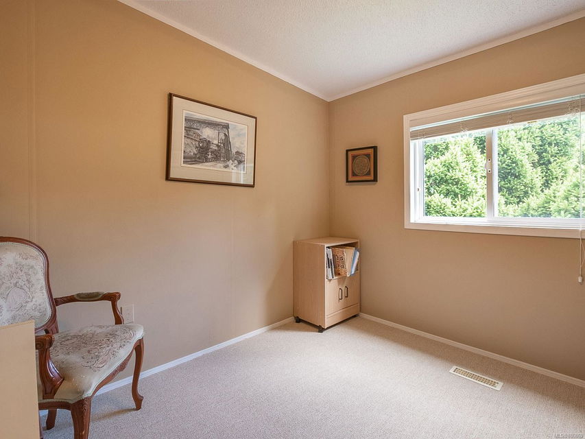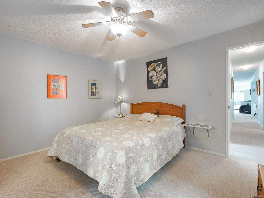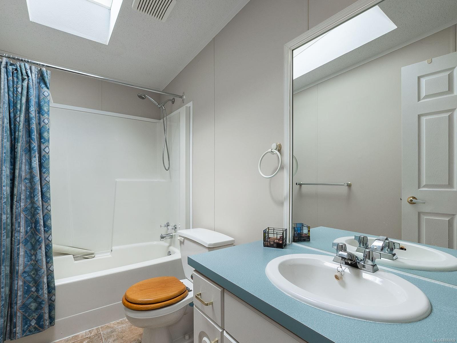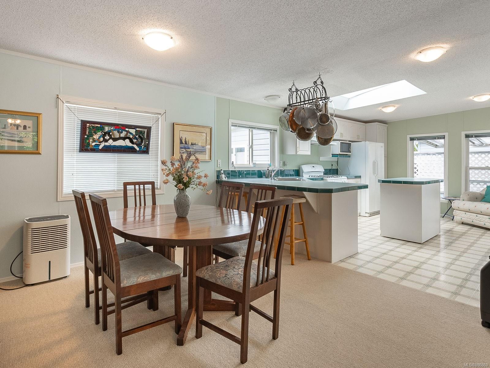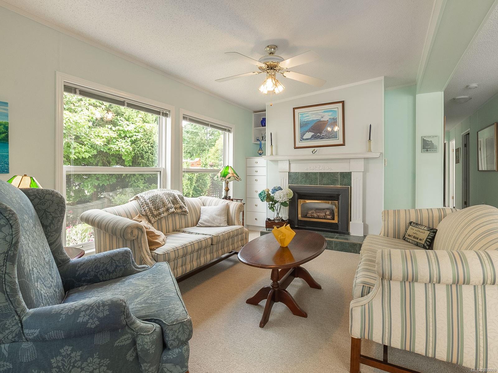 It begins with great street appeal & leads into a bright, fresh 1487 sq. ft. double wide home in a quiet 55+ neighborhood in Ladysmith. This well- maintained gem is ready to welcome new owners. The impressive kitchen features ample work & cupboard space, skylight & island. The front room is extra comfortable with a gas fireplace and the family room features a vaulted ceiling. There are 3 bedrooms & 2 baths, with the primary bedroom ideally located at the back of the home with a 3 piece ensuite. Skylights add loads of natural light. Fresh upgrades include new carpets throughout & new air conditioning. Enjoy a covered deck, easy parking in the covered carport and shed for extra storage. With a lovely garden & forested hills in the backdrop, this home’s private setting on a corner lot in a cul-de-sac will appeal to many. With shopping nearby and access to bus service, learn how easy it is to slide into Ladysmith living!