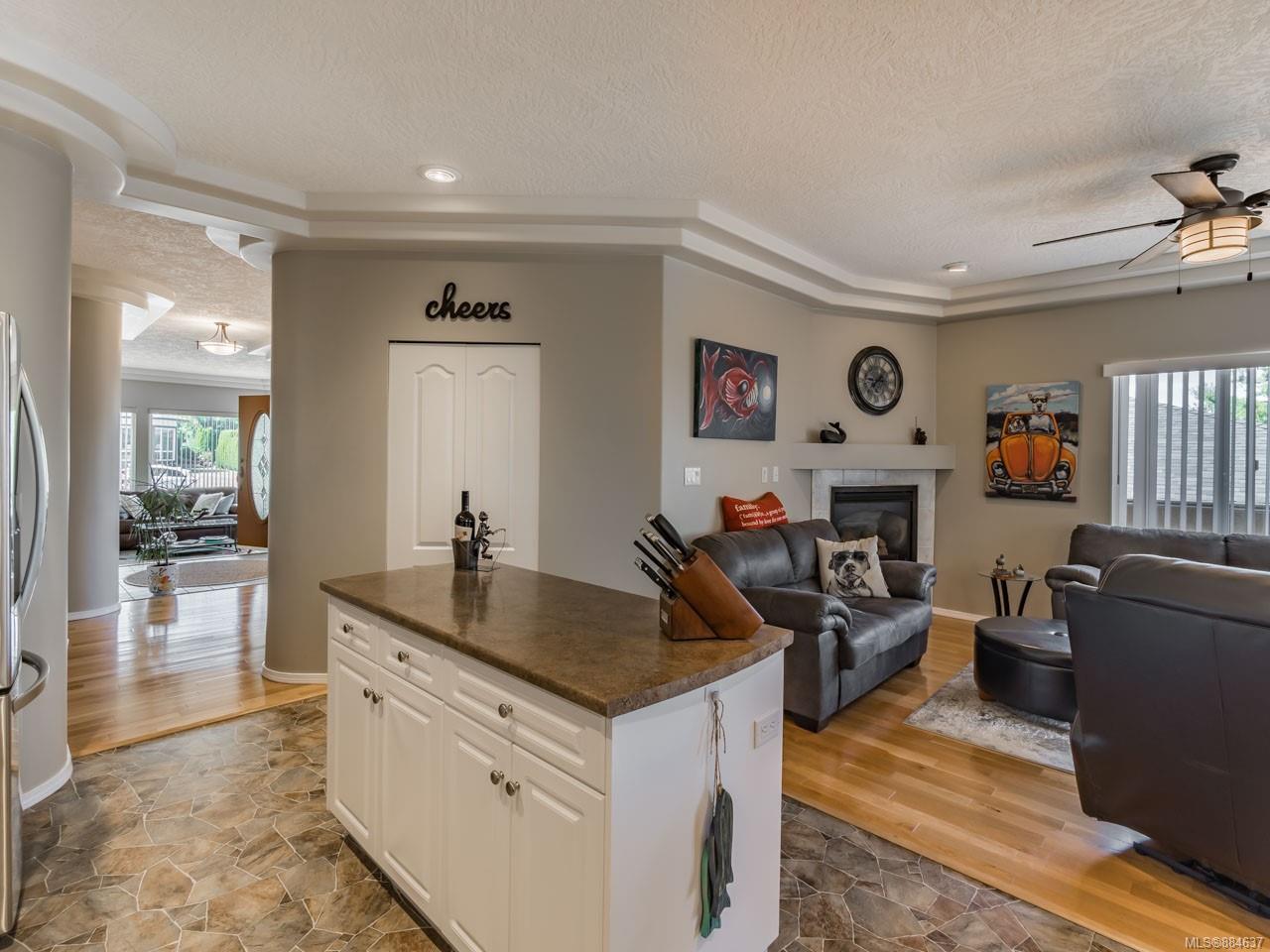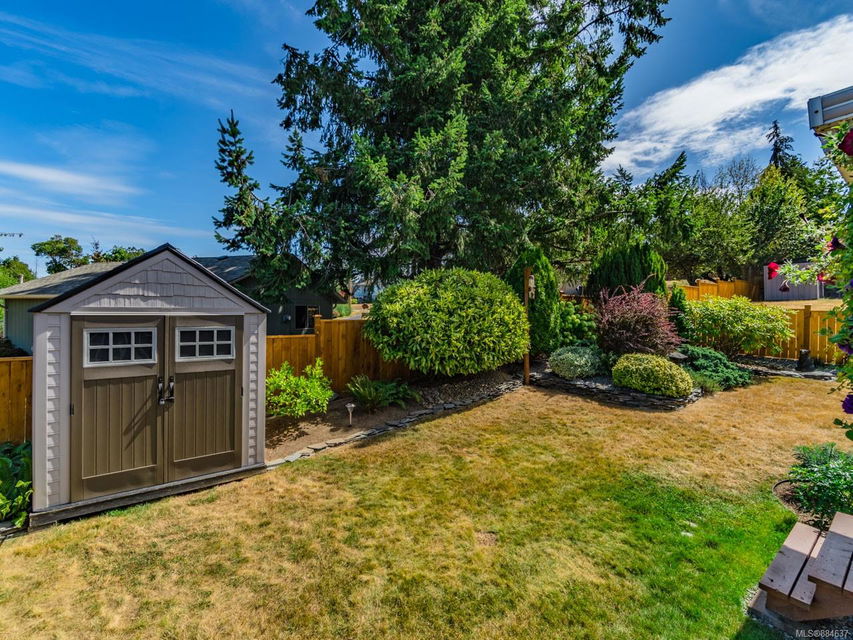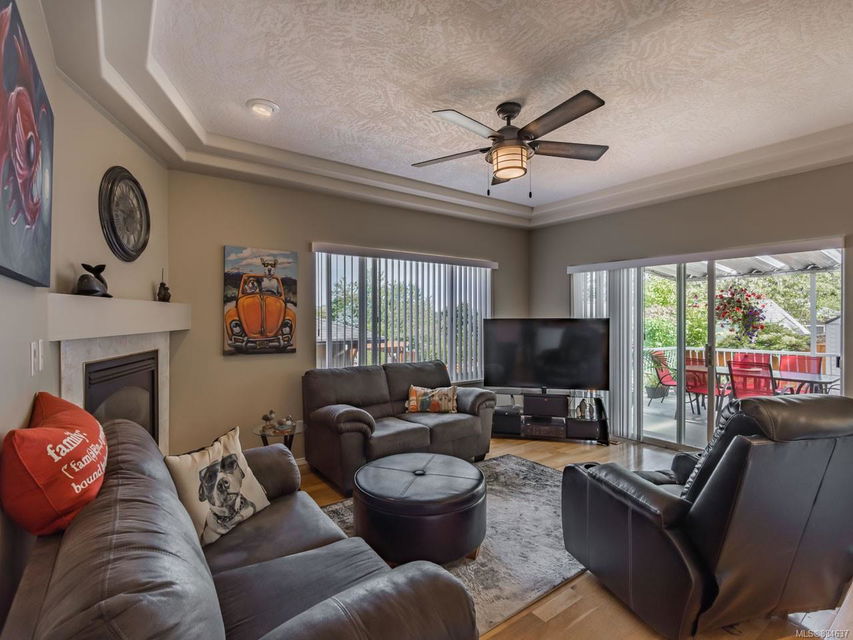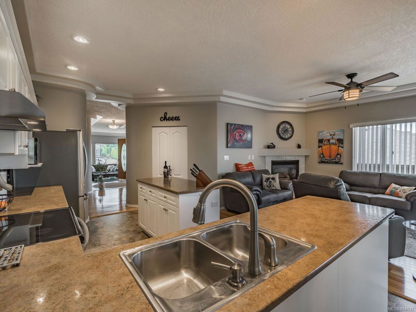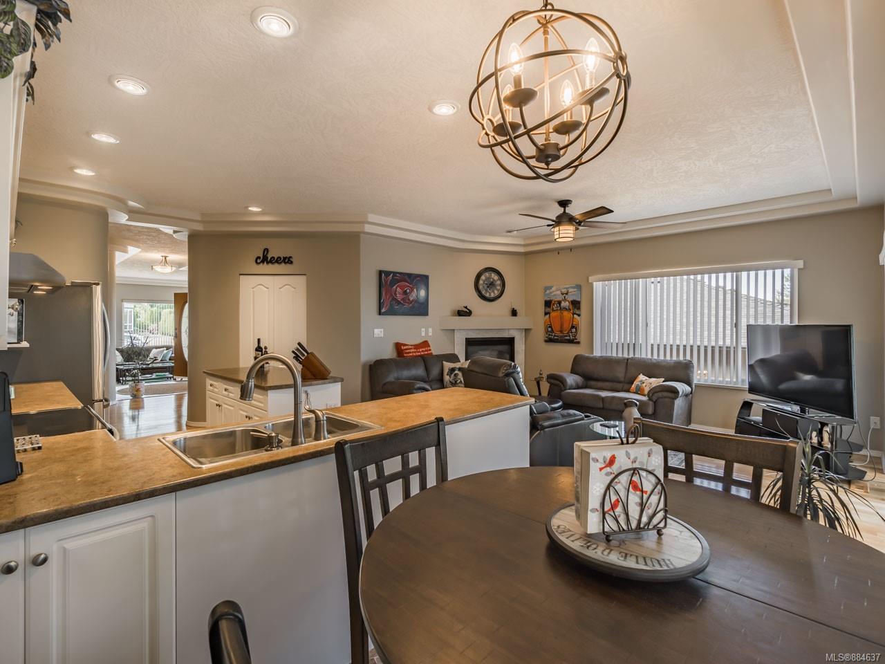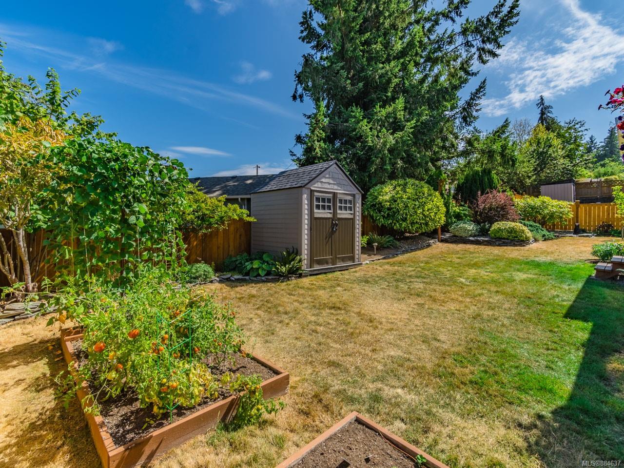 kitchen/breakfast nook/family room area. The principal bedroom features a walk-in closet and ensuite, and the main bath has a relaxing soaker tub. Updated fixtures, natural gas fireplace and furnace, shed, and raised garden beds are all part of