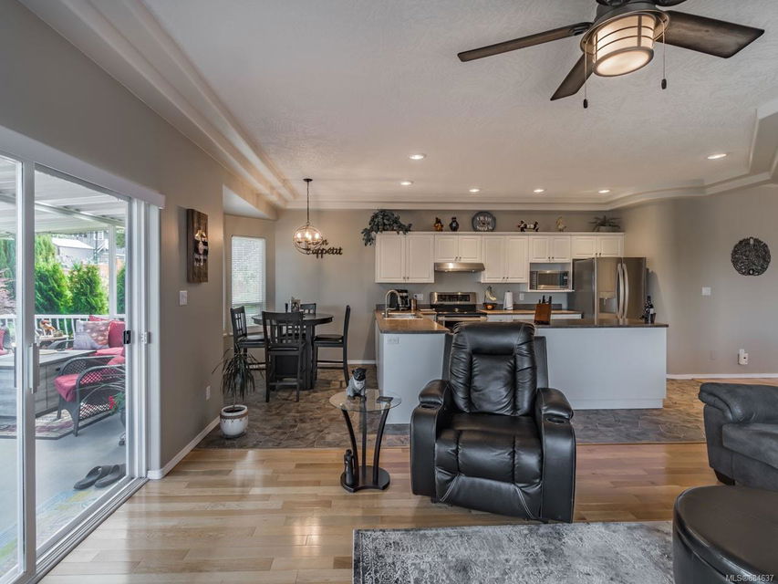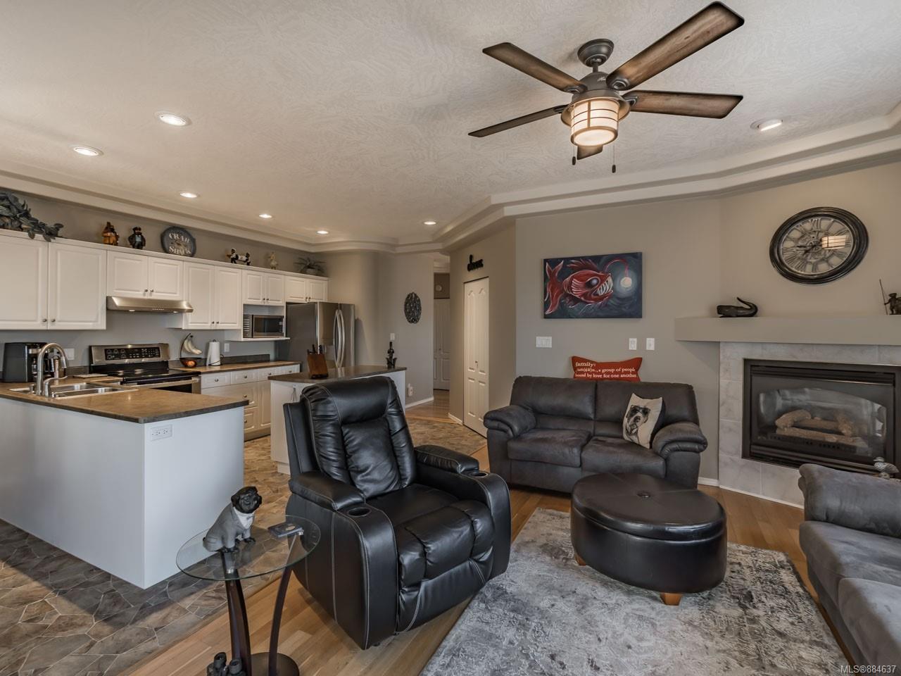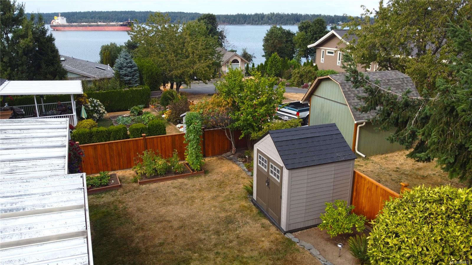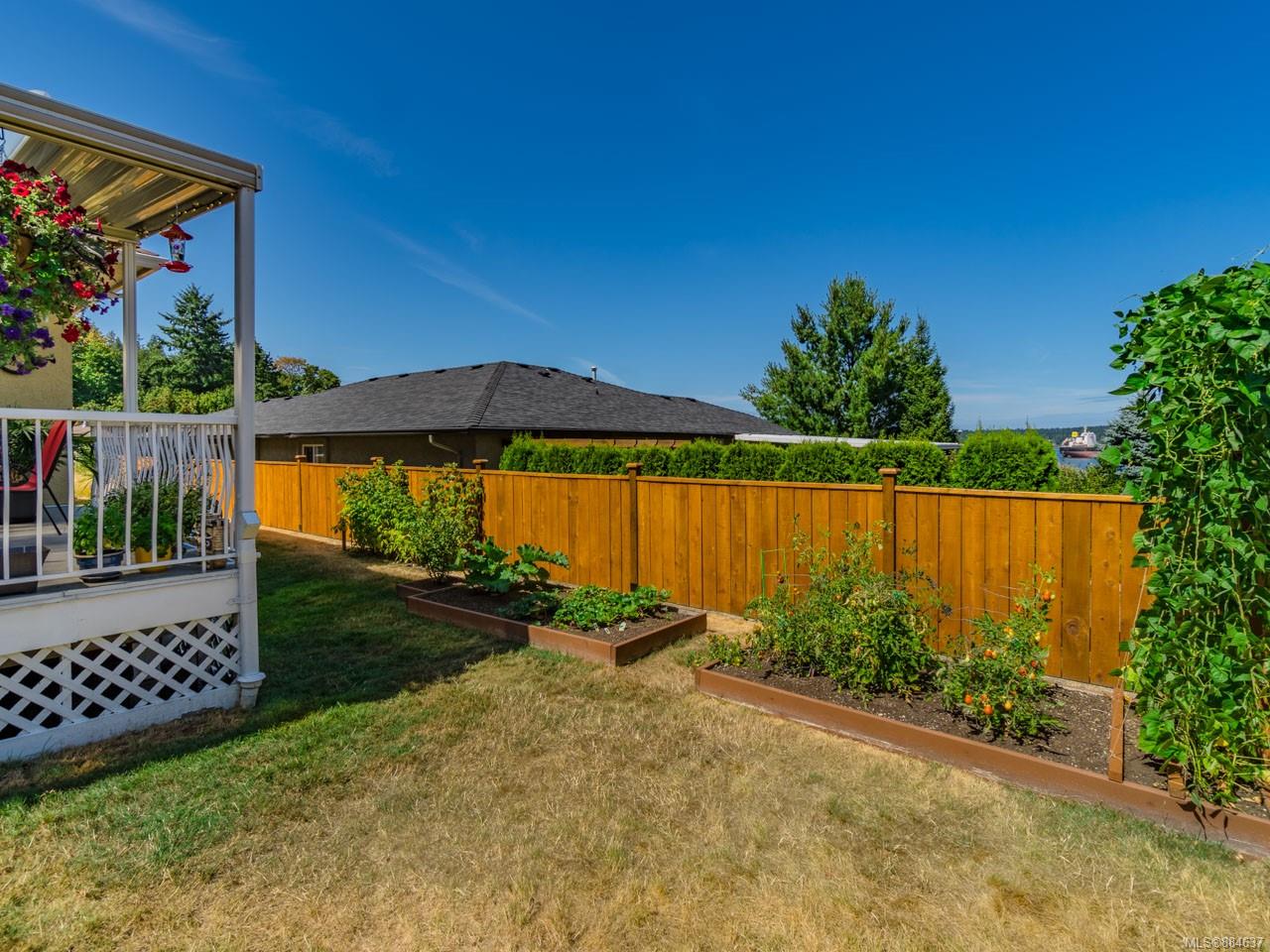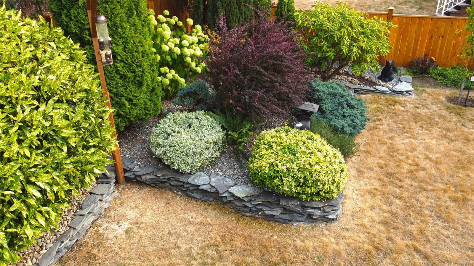 kitchen/breakfast nook/family room area. The principal bedroom features a walk-in closet and ensuite, and the main bath has a relaxing soaker tub. Updated fixtures, natural gas fireplace and furnace, shed, and raised garden beds are all part of