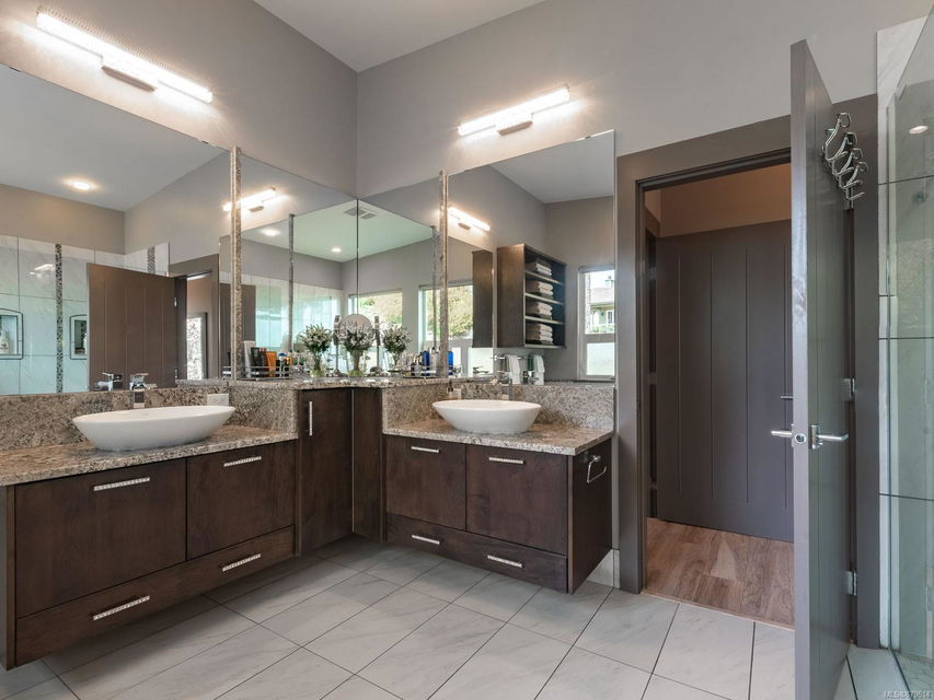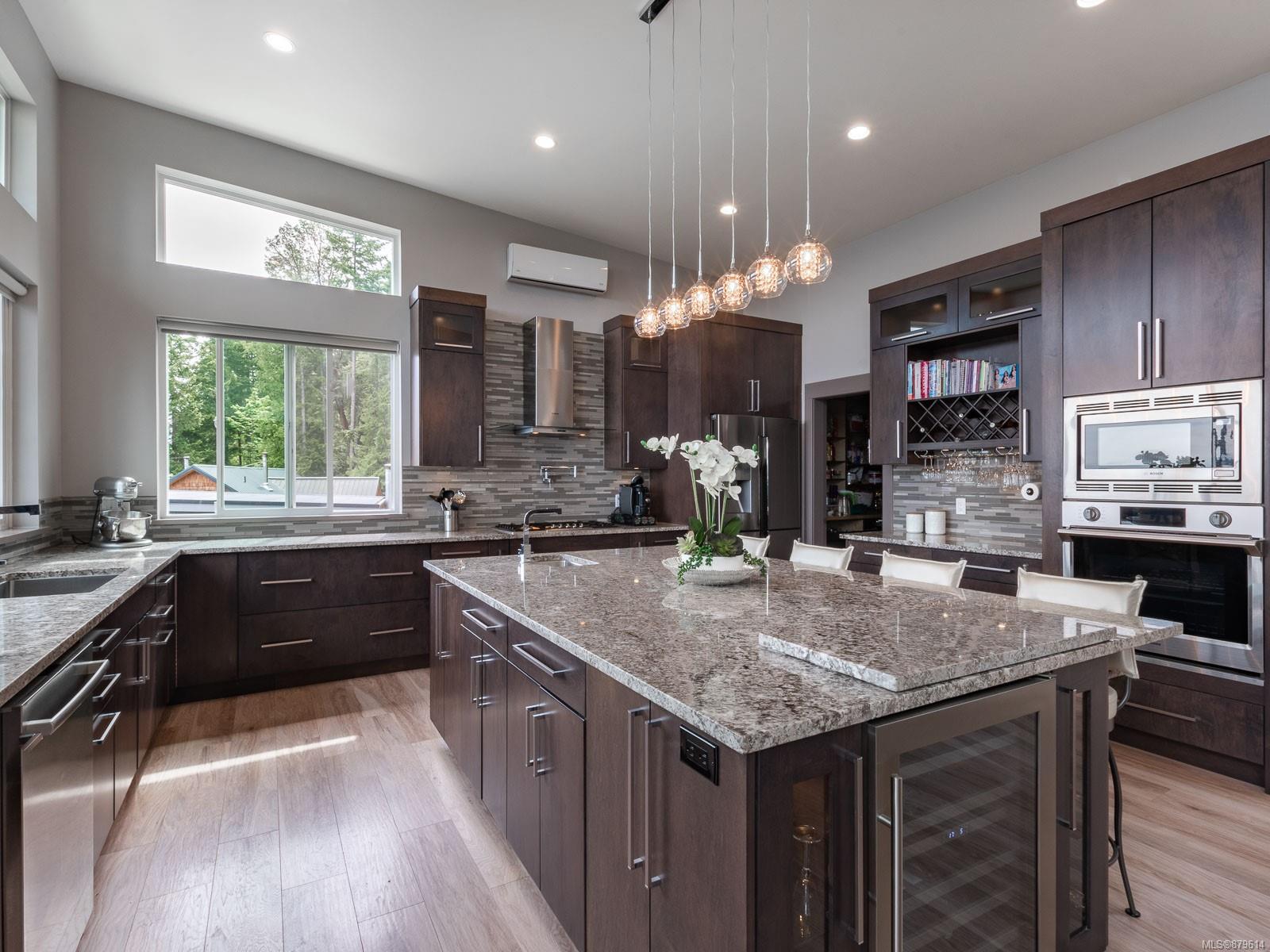 bathrooms; 2 kitchens (main w/large island, show stopping pantry, wine fridge); 2 laundry rooms; 2 garages