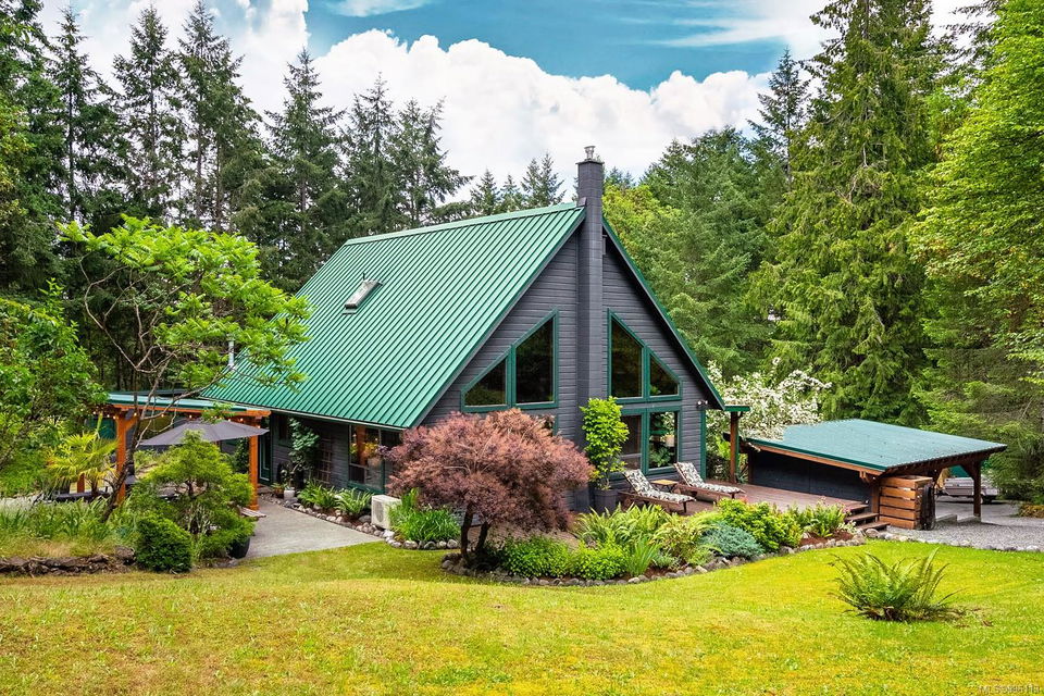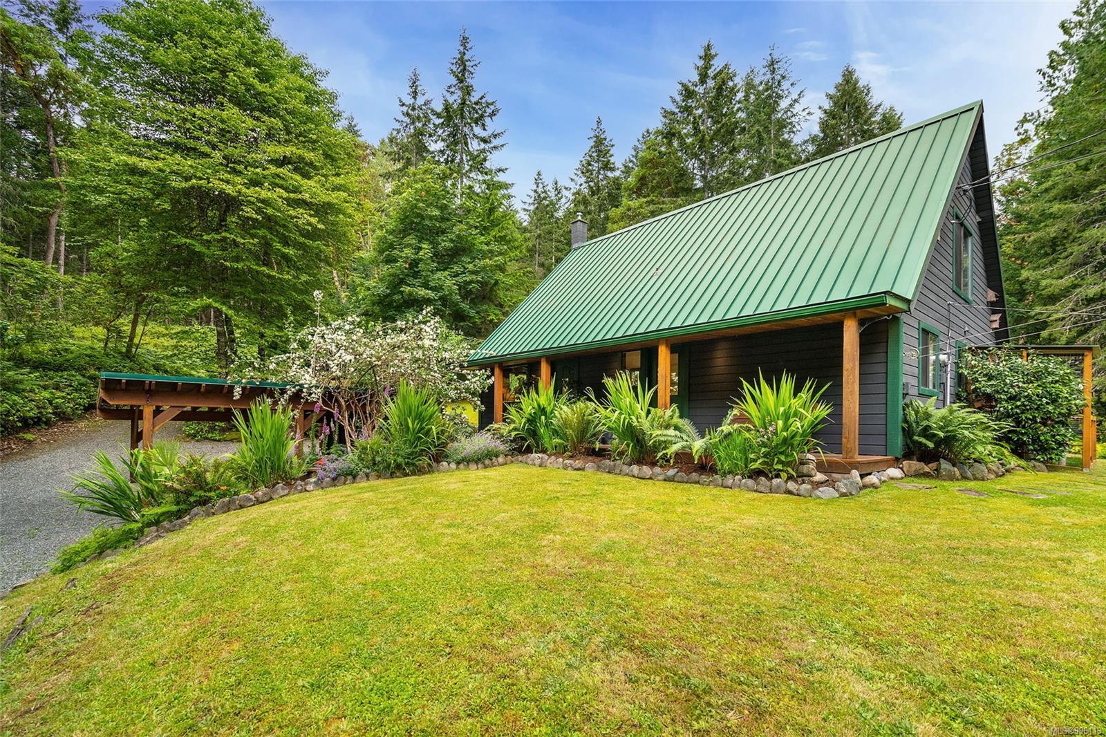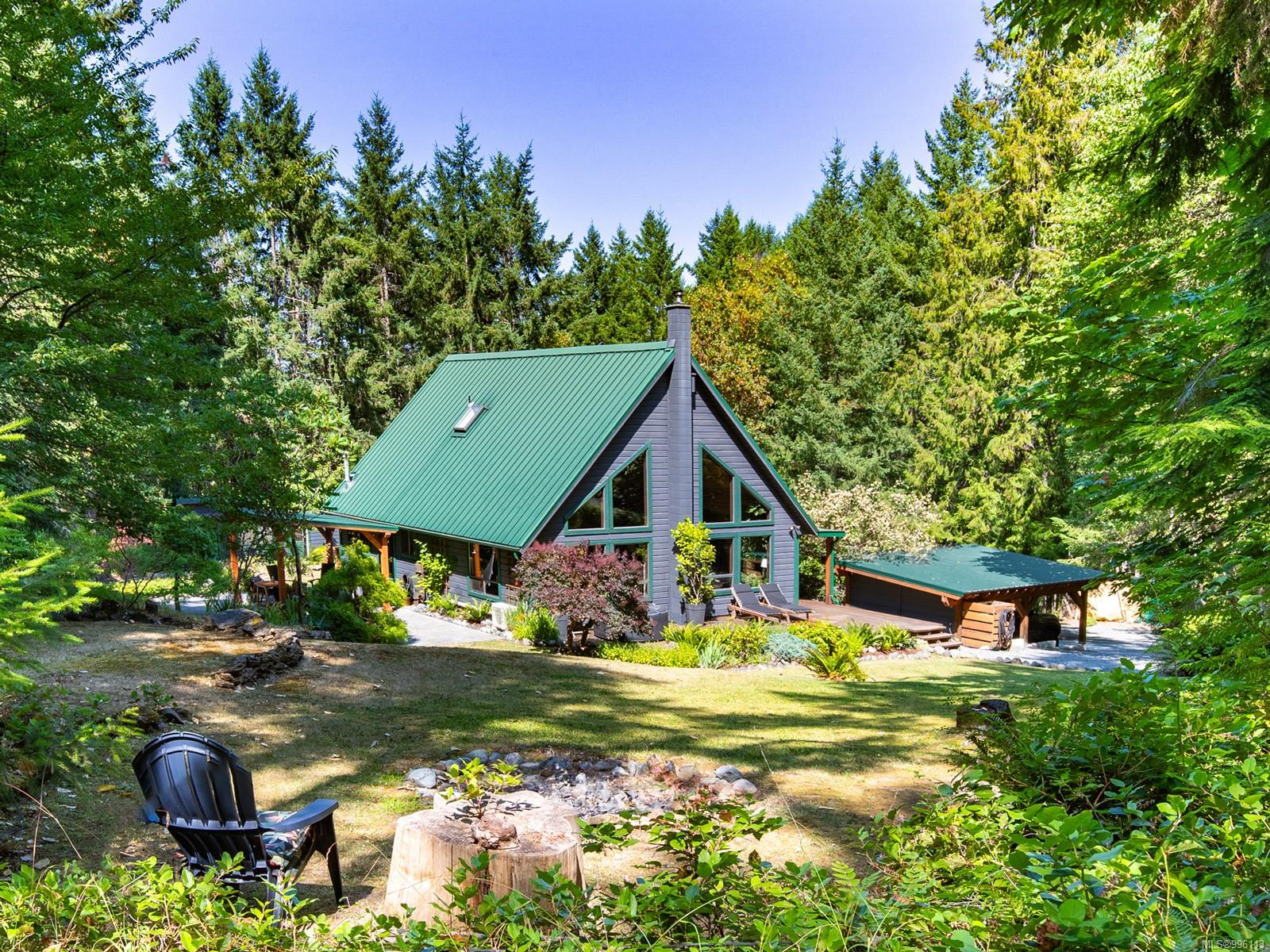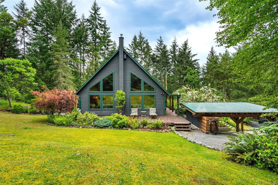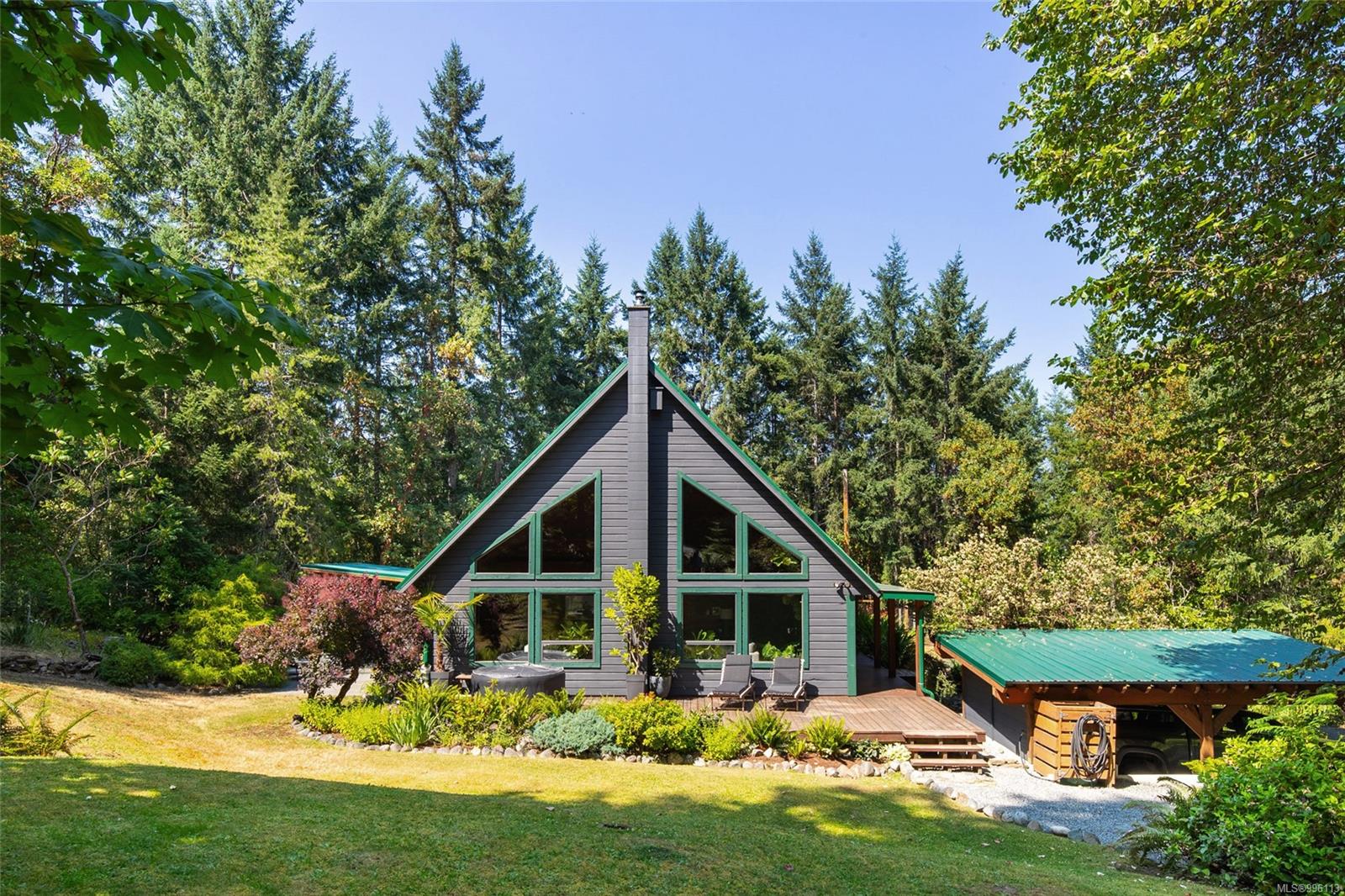 Sanctuary on your own 5.5 acre. Spacious, secluded, beautifully landscaped property, featuring a home that feels like a mountain retreat. Grand windows beautifully frame the wooded outdoors. Two bright bedrooms, two baths with an open living space with a cathedral ceiling and woodstove, plus a gas stove in the dining area opening to the kitchen with gas range, farmhouse sink, & new flooring. Updates are a kitchen reno, new paint, window coverings & heat pump. The primary bedroom is on the second level with a walk-in closet with built-ins. Second dwelling permitted perfect for multi-generational home or a rental. Ample room in & out and an outbuilding for a home/gym/office. This covered deck, firepit area, fenced raised garden beds, diverse vegetation, and birdsong. Carport & garage parking & plenty of room for an RV. Additional building on the property to use as you desire! Swing from a hammock and enjoy your oasis in this lovely, rural area of Vancouver Island not far from Nanaimo.