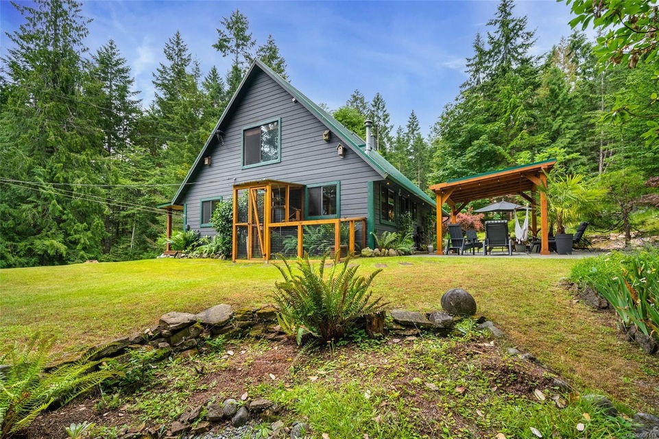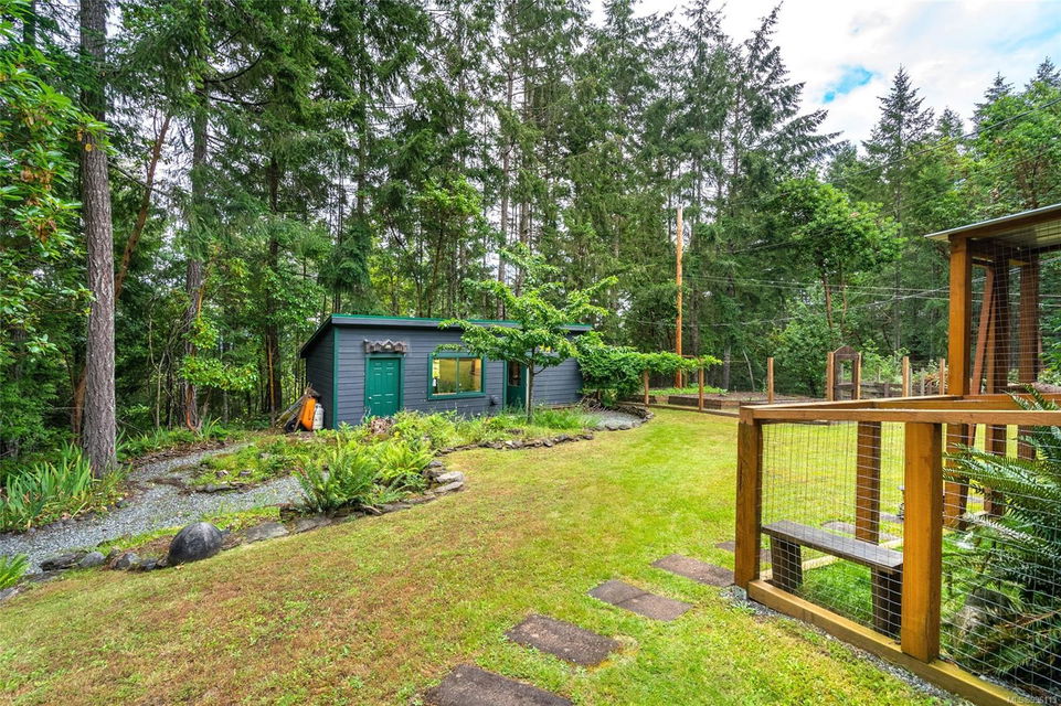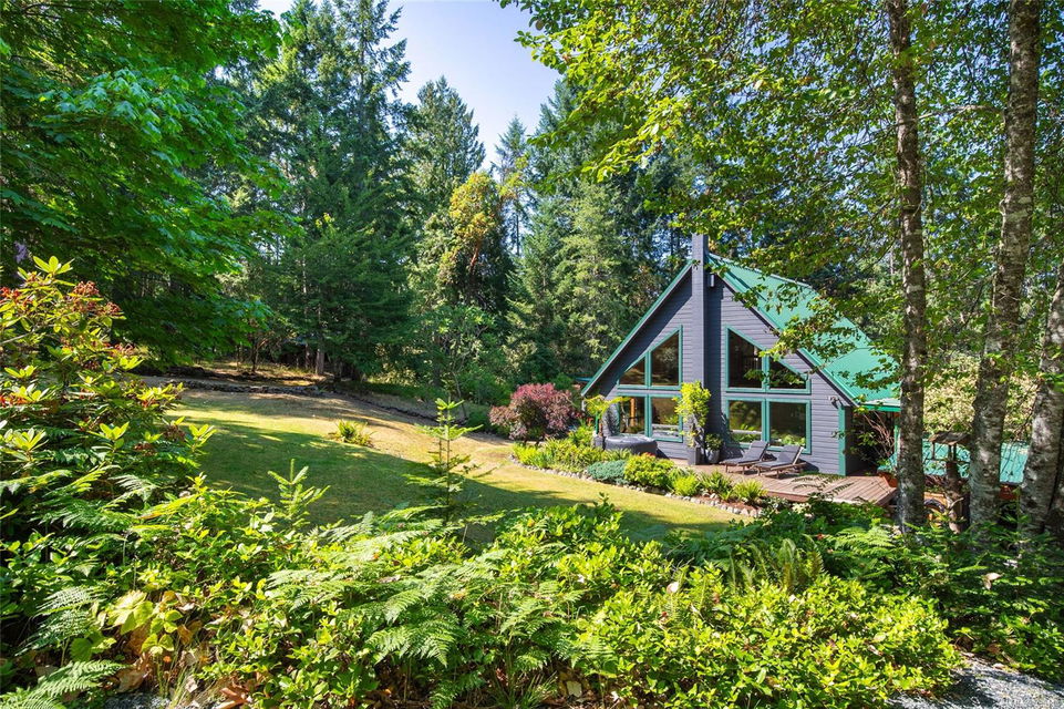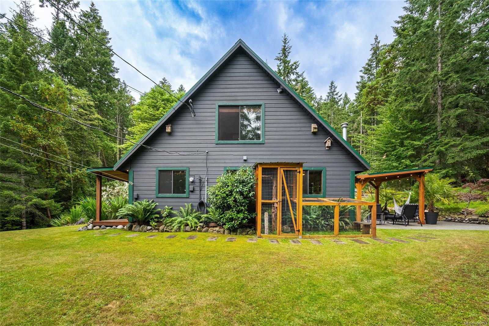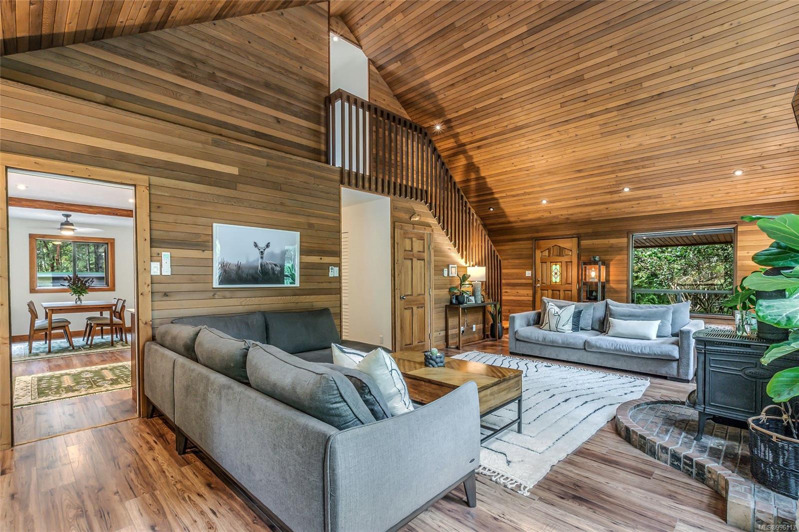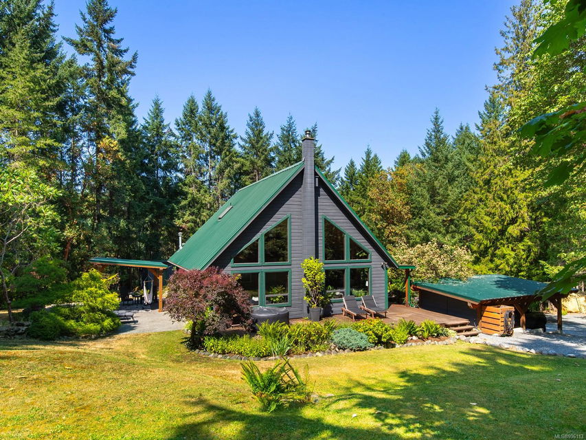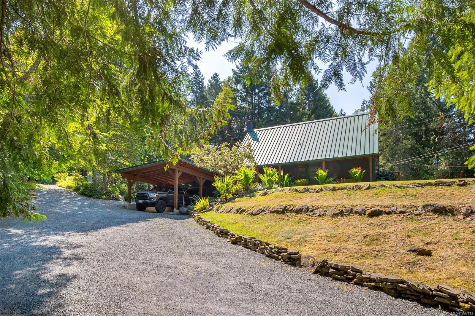 Sanctuary on your own 5.5 acre. Spacious, secluded, beautifully landscaped property, featuring a home that feels like a mountain retreat. Grand windows beautifully frame the wooded outdoors. Two bright bedrooms, two baths with an open living space with a cathedral ceiling and woodstove, plus a gas stove in the dining area opening to the kitchen with gas range, farmhouse sink, & new flooring. Updates are a kitchen reno, new paint, window coverings & heat pump. The primary bedroom is on the second level with a walk-in closet with built-ins. Second dwelling permitted perfect for multi-generational home or a rental. Ample room in & out and an outbuilding for a home/gym/office. This covered deck, firepit area, fenced raised garden beds, diverse vegetation, and birdsong. Carport & garage parking & plenty of room for an RV. Additional building on the property to use as you desire! Swing from a hammock and enjoy your oasis in this lovely, rural area of Vancouver Island not far from Nanaimo.