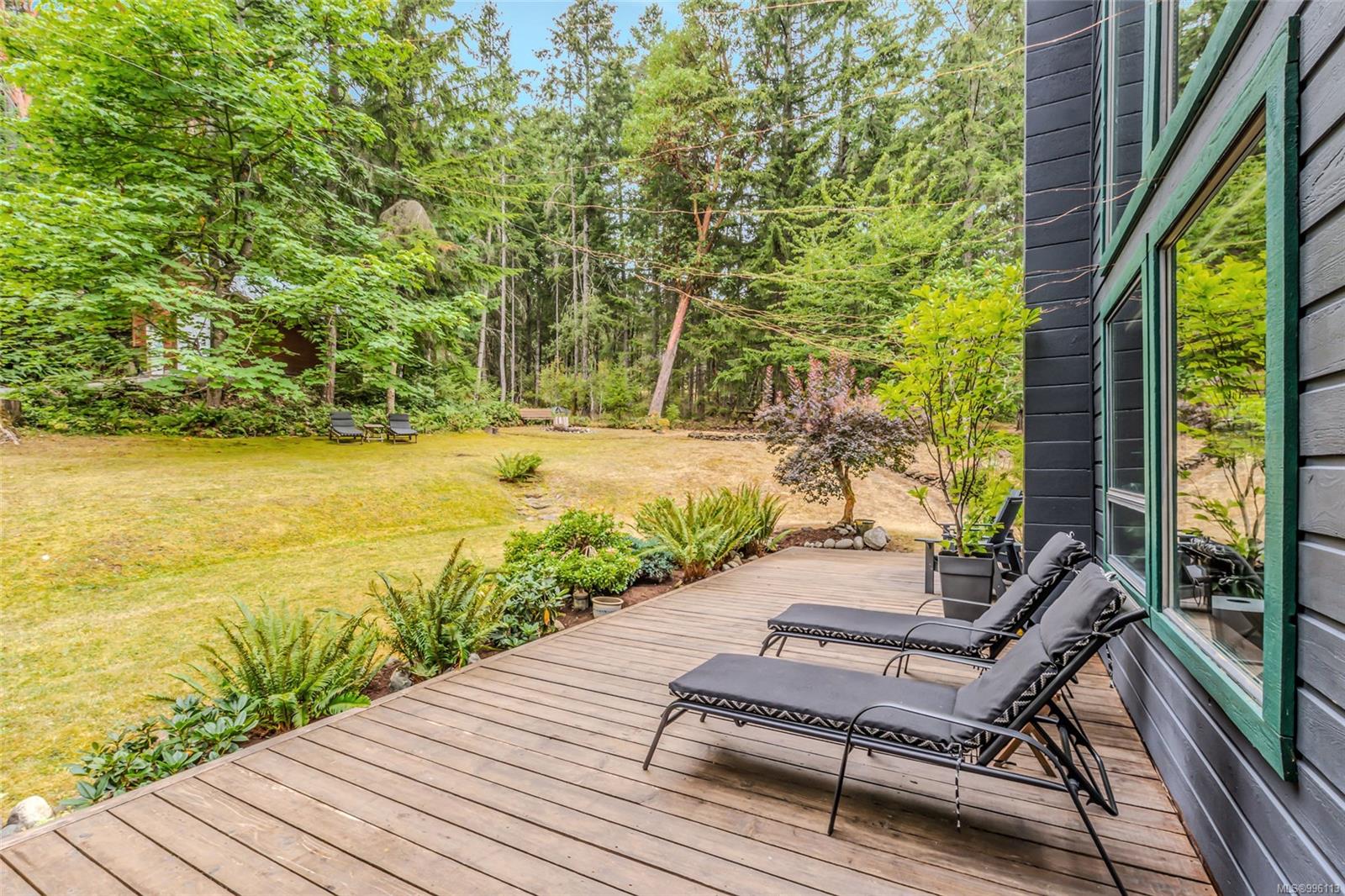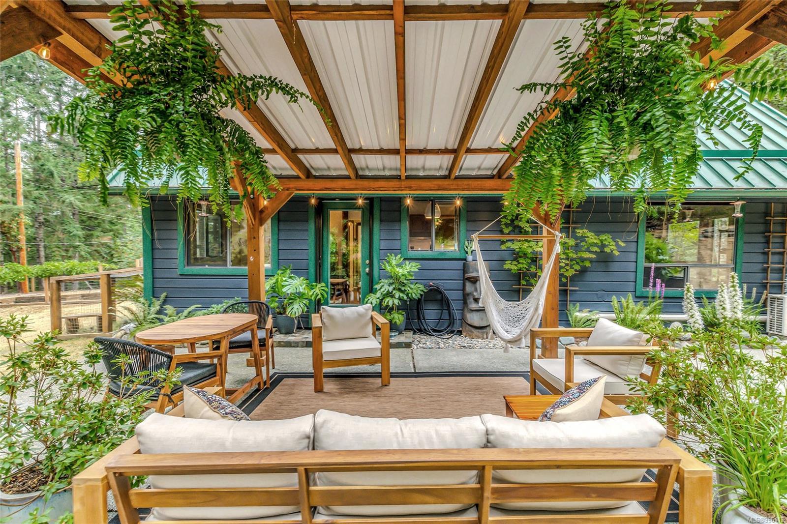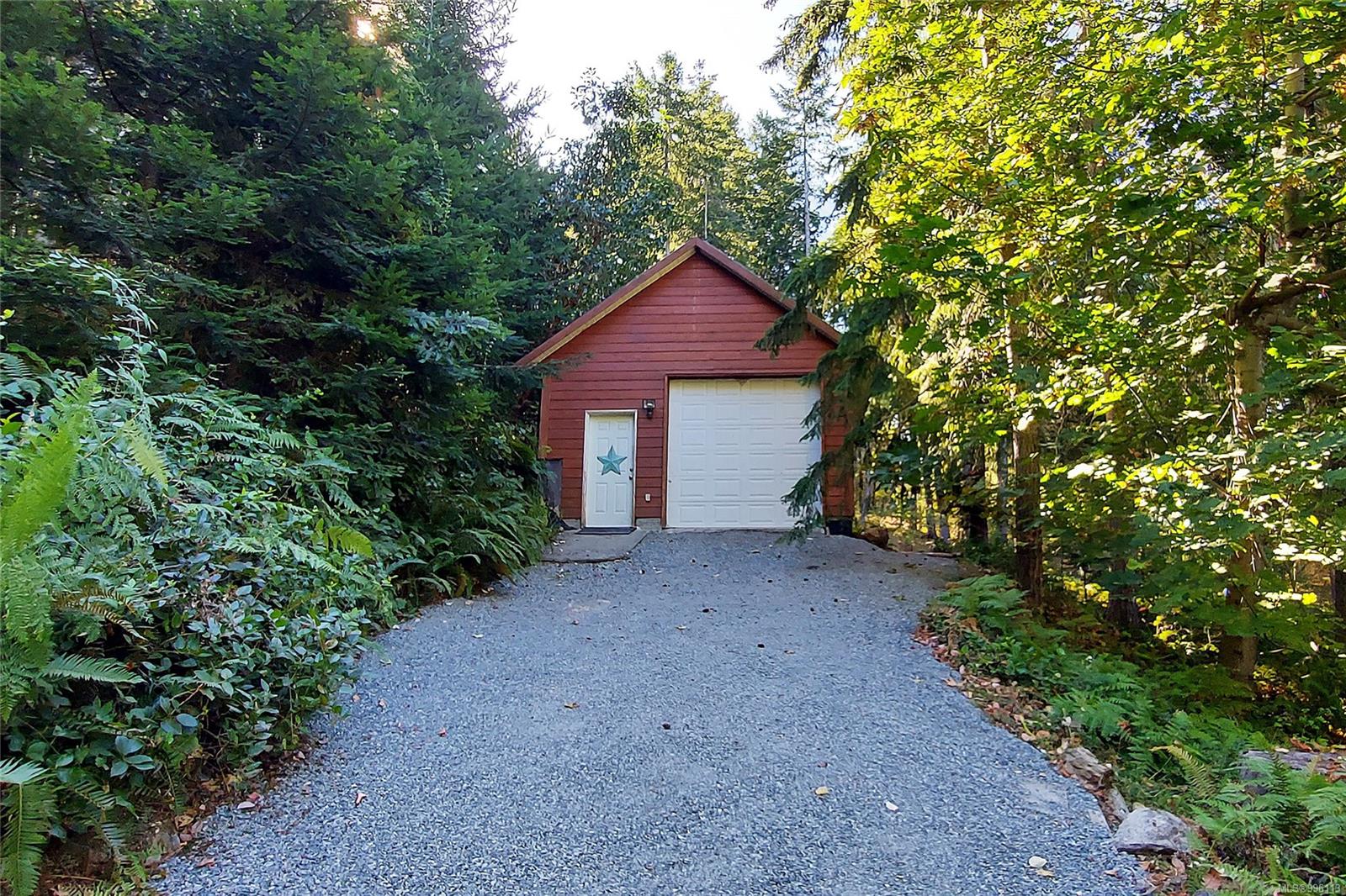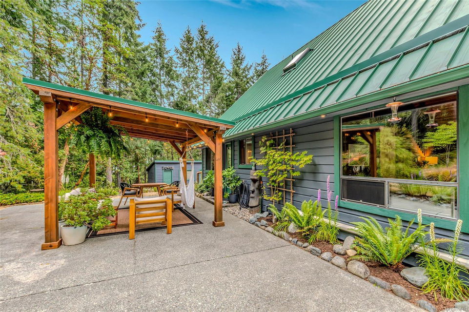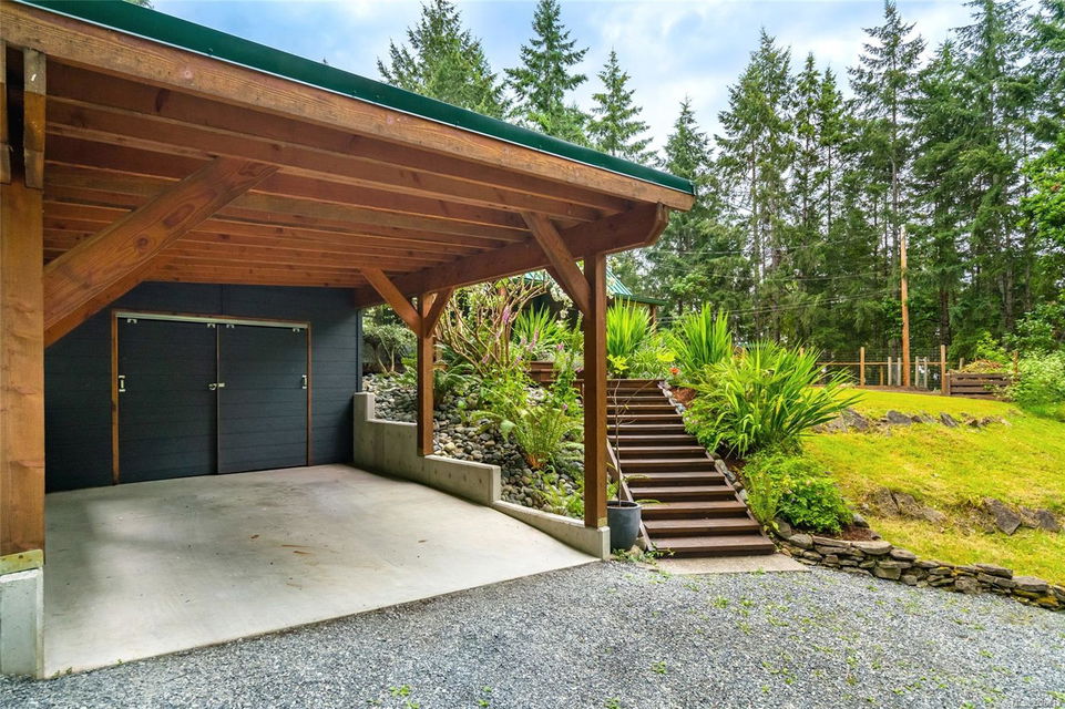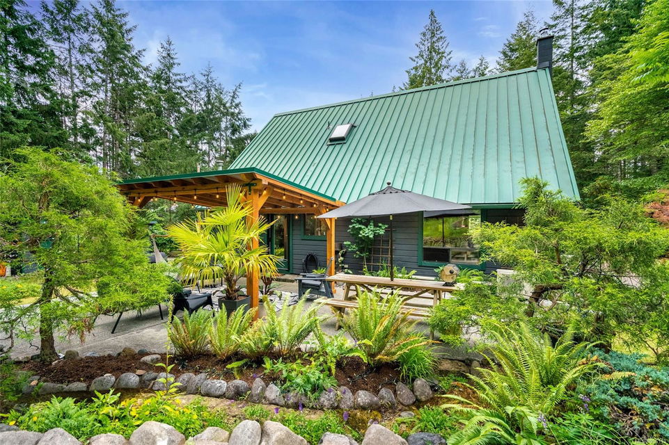 Sanctuary on your own 5.5 acre. Spacious, secluded, beautifully landscaped property, featuring a home that feels like a mountain retreat. Grand windows beautifully frame the wooded outdoors. Two bright bedrooms, two baths with an open living space with a cathedral ceiling and woodstove, plus a gas stove in the dining area opening to the kitchen with gas range, farmhouse sink, & new flooring. Updates are a kitchen reno, new paint, window coverings & heat pump. The primary bedroom is on the second level with a walk-in closet with built-ins. Second dwelling permitted perfect for multi-generational home or a rental. Ample room in & out and an outbuilding for a home/gym/office. This covered deck, firepit area, fenced raised garden beds, diverse vegetation, and birdsong. Carport & garage parking & plenty of room for an RV. Additional building on the property to use as you desire! Swing from a hammock and enjoy your oasis in this lovely, rural area of Vancouver Island not far from Nanaimo.