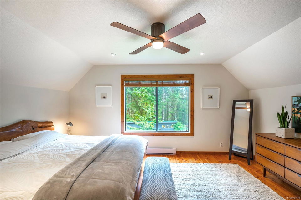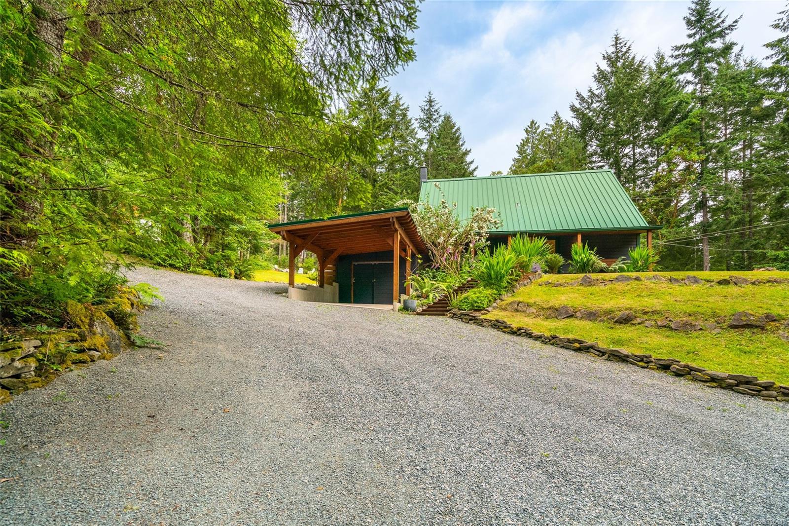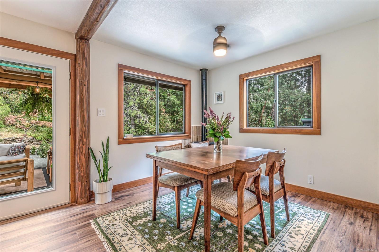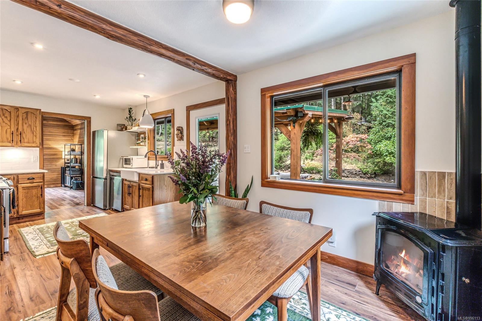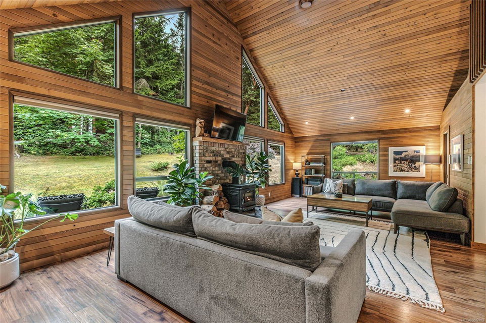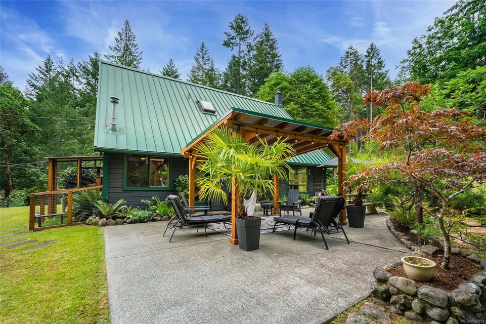 Sanctuary on your own 5.5 acre. Spacious, secluded, beautifully landscaped property, featuring a home that feels like a mountain retreat. Grand windows beautifully frame the wooded outdoors. Two bright bedrooms, two baths with an open living space with a cathedral ceiling and woodstove, plus a gas stove in the dining area opening to the kitchen with gas range, farmhouse sink, & new flooring. Updates are a kitchen reno, new paint, window coverings & heat pump. The primary bedroom is on the second level with a walk-in closet with built-ins. Second dwelling permitted perfect for multi-generational home or a rental. Ample room in & out and an outbuilding for a home/gym/office. This covered deck, firepit area, fenced raised garden beds, diverse vegetation, and birdsong. Carport & garage parking & plenty of room for an RV. Additional building on the property to use as you desire! Swing from a hammock and enjoy your oasis in this lovely, rural area of Vancouver Island not far from Nanaimo.