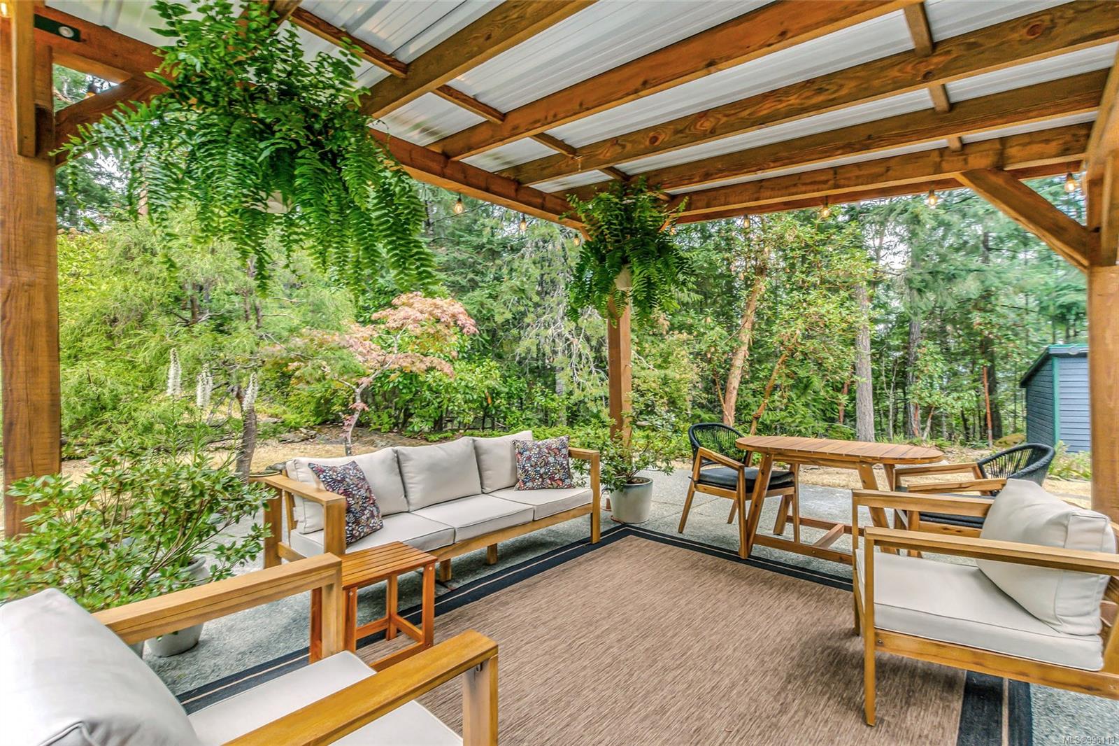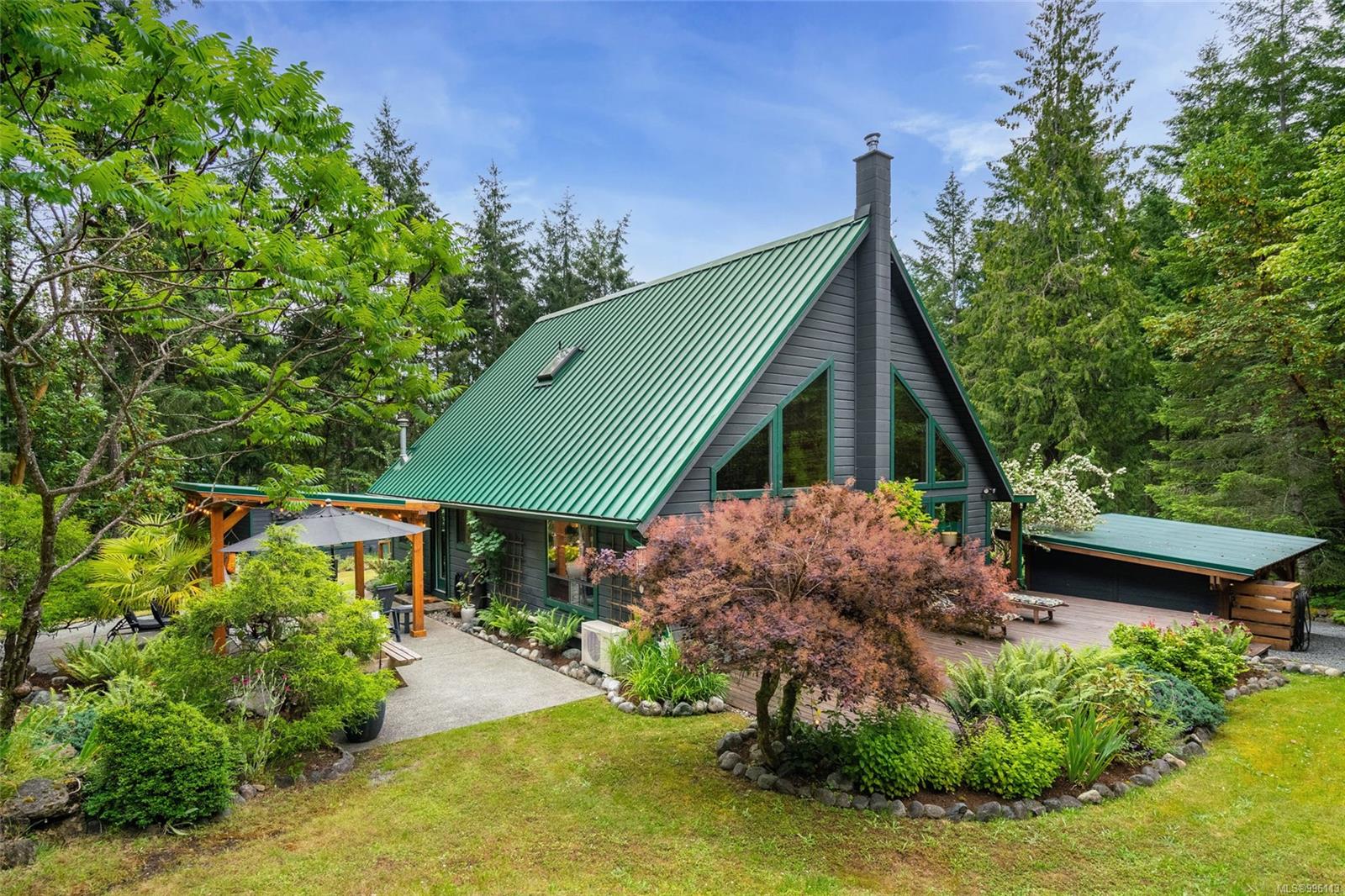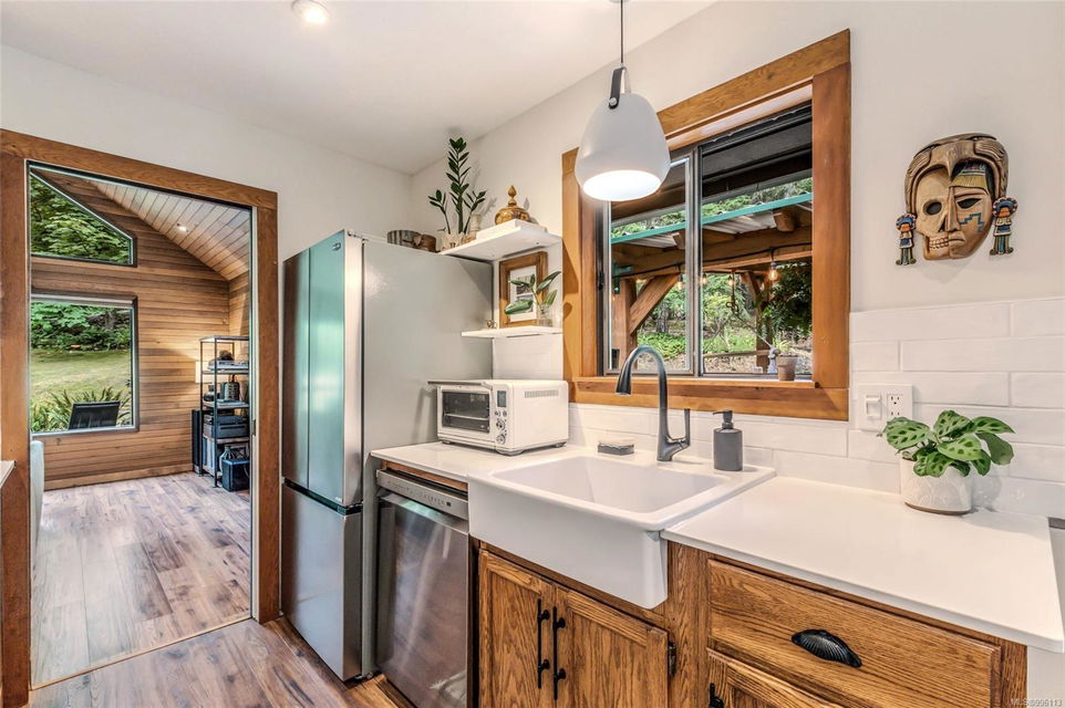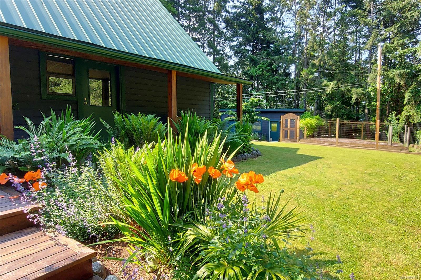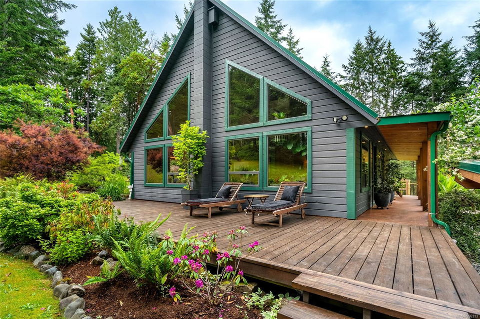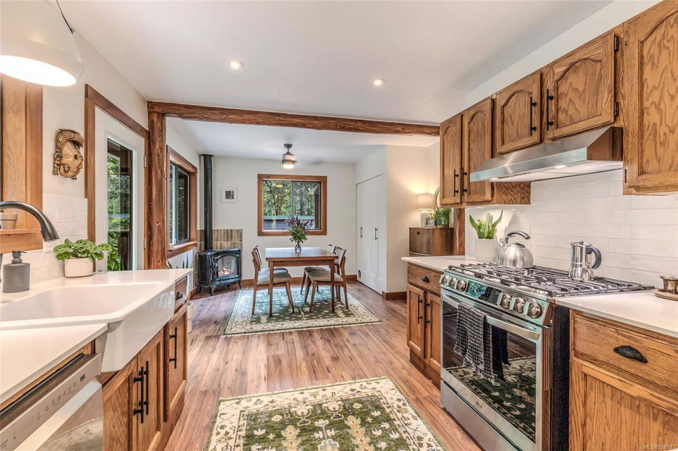 Sanctuary on your own 5.5 acre. Spacious, secluded, beautifully landscaped property, featuring a home that feels like a mountain retreat. Grand windows beautifully frame the wooded outdoors. Two bright bedrooms, two baths with an open living space with a cathedral ceiling and woodstove, plus a gas stove in the dining area opening to the kitchen with gas range, farmhouse sink, & new flooring. Updates are a kitchen reno, new paint, window coverings & heat pump. The primary bedroom is on the second level with a walk-in closet with built-ins. Second dwelling permitted perfect for multi-generational home or a rental. Ample room in & out and an outbuilding for a home/gym/office. This covered deck, firepit area, fenced raised garden beds, diverse vegetation, and birdsong. Carport & garage parking & plenty of room for an RV. Additional building on the property to use as you desire! Swing from a hammock and enjoy your oasis in this lovely, rural area of Vancouver Island not far from Nanaimo.