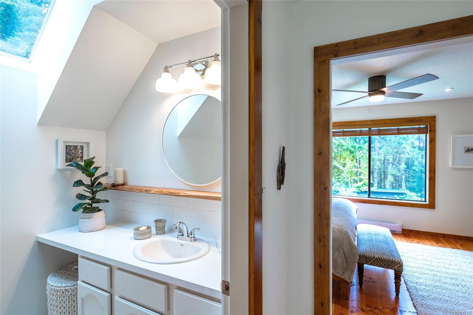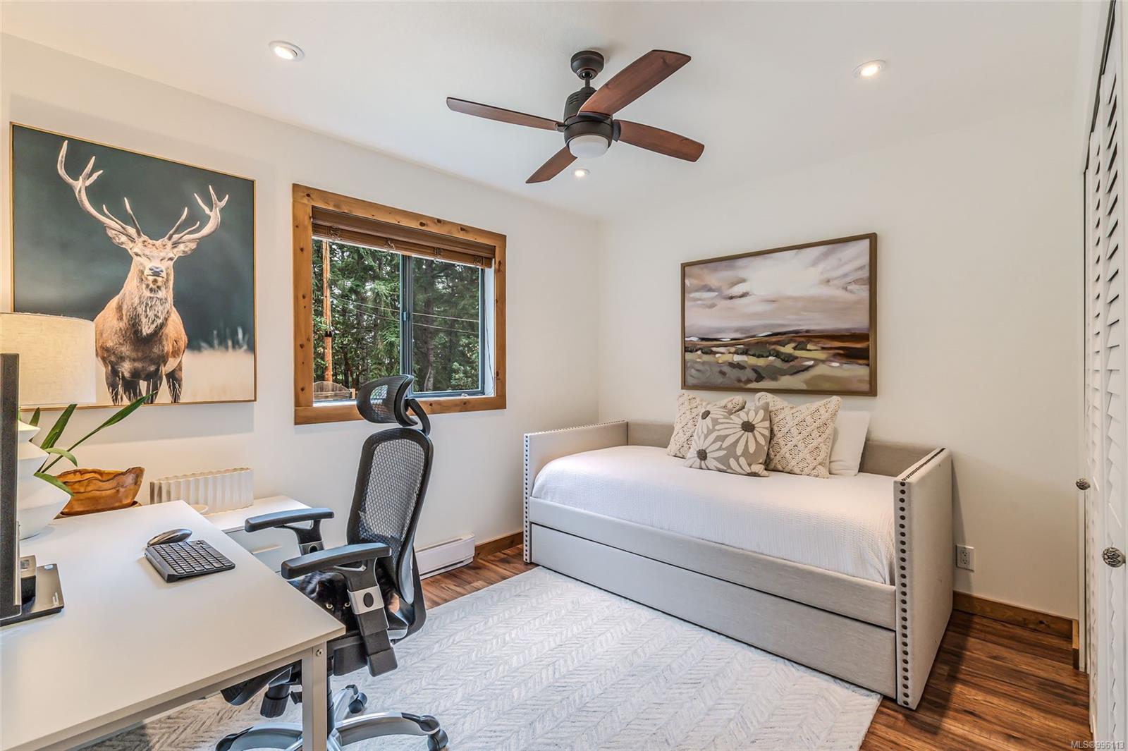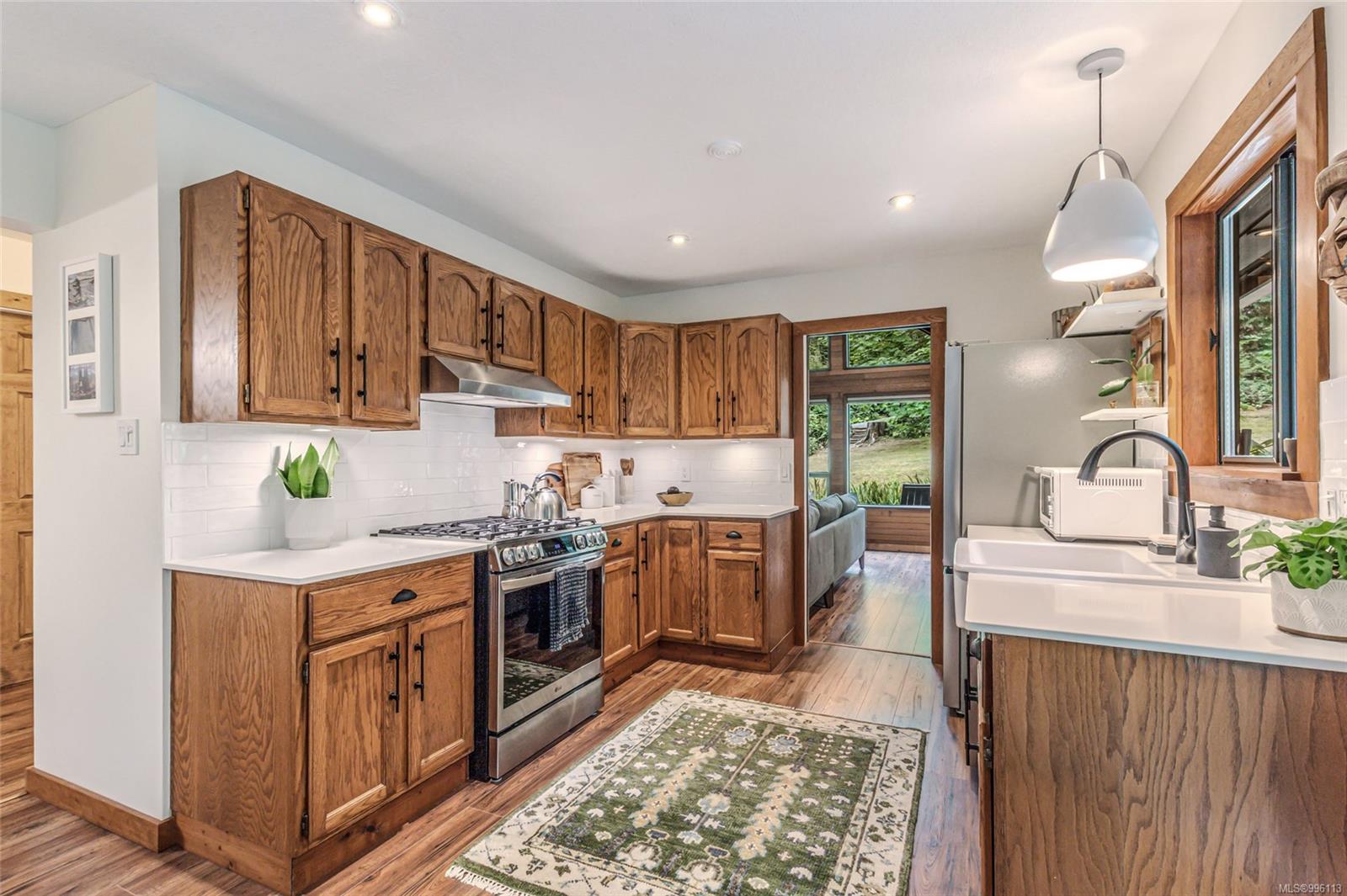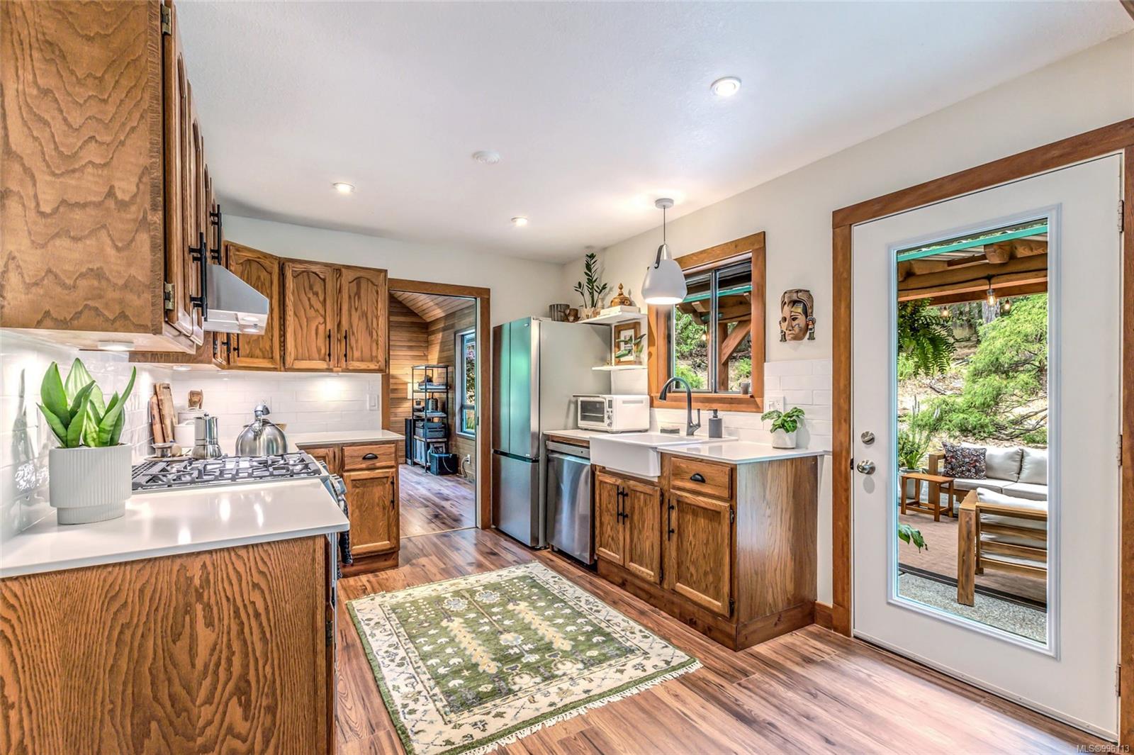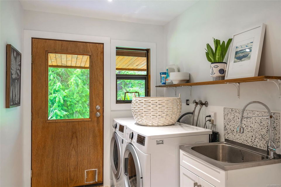 Sanctuary on your own 5.5 acre. Spacious, secluded, beautifully landscaped property, featuring a home that feels like a mountain retreat. Grand windows beautifully frame the wooded outdoors. Two bright bedrooms, two baths with an open living space with a cathedral ceiling and woodstove, plus a gas stove in the dining area opening to the kitchen with gas range, farmhouse sink, & new flooring. Updates are a kitchen reno, new paint, window coverings & heat pump. The primary bedroom is on the second level with a walk-in closet with built-ins. Second dwelling permitted perfect for multi-generational home or a rental. Ample room in & out and an outbuilding for a home/gym/office. This covered deck, firepit area, fenced raised garden beds, diverse vegetation, and birdsong. Carport & garage parking & plenty of room for an RV. Additional building on the property to use as you desire! Swing from a hammock and enjoy your oasis in this lovely, rural area of Vancouver Island not far from Nanaimo.